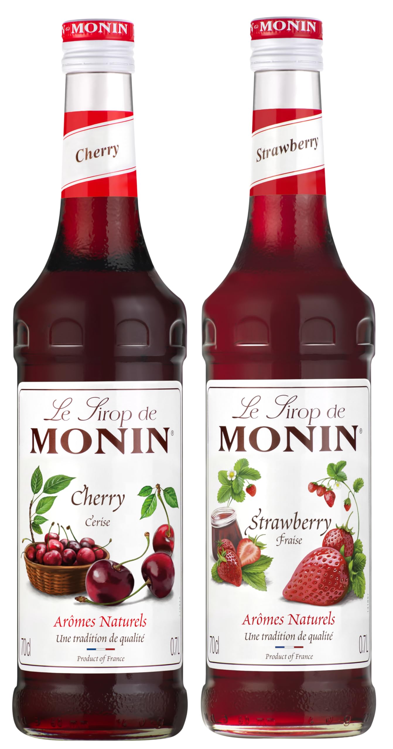RECIPE IDEA: 30 ml Cherry Syrup, 150 ml tea, and 1 lemon slice - Pour all the ingredients into a shaker filled with ice and shake vigorously. Pour into a glass and garnish. Enjoy! MONIN Strawberry Syrup captures the delicious flavor of strawberries and will add a touch of sweetness to all your drinks, with or without alcohol. MONIN Cherry Syrup will give all your drinks a delicious summery taste. Enjoy it in iced tea, a frappe, a dark chocolate drink, or a gin and tonic.IDEE RECETTE : 30 ml de Sirop de Cerise, 150 ml de thé et 1 tranche de citron - Verser tous les ingrédients dans un shaker rempli de glaçons et shaker vigoureusement. Verser dans une verre et décorer. Bonne dégustation. Le sirop de Fraise MONIN capture la saveur délicieuse de la fraise et apportera une touche de douceur à l'ensemble de vos boissons, avec ou sans alcool. Le sirop de Cerise MONIN donnera à toutes vos boissons un délicieux goût estival. Dégustez-le dans un thé glacé, un frappé au un chocolat noir ou un gin tonic.MONIN - Assortiment de Fruits Rouges de Sirop de Cerise et de Sirop de Fraise pour Cocktail pétillant, Cocktail, Thé Glacé et Limonade - Arômes Naturels - 2 70cl