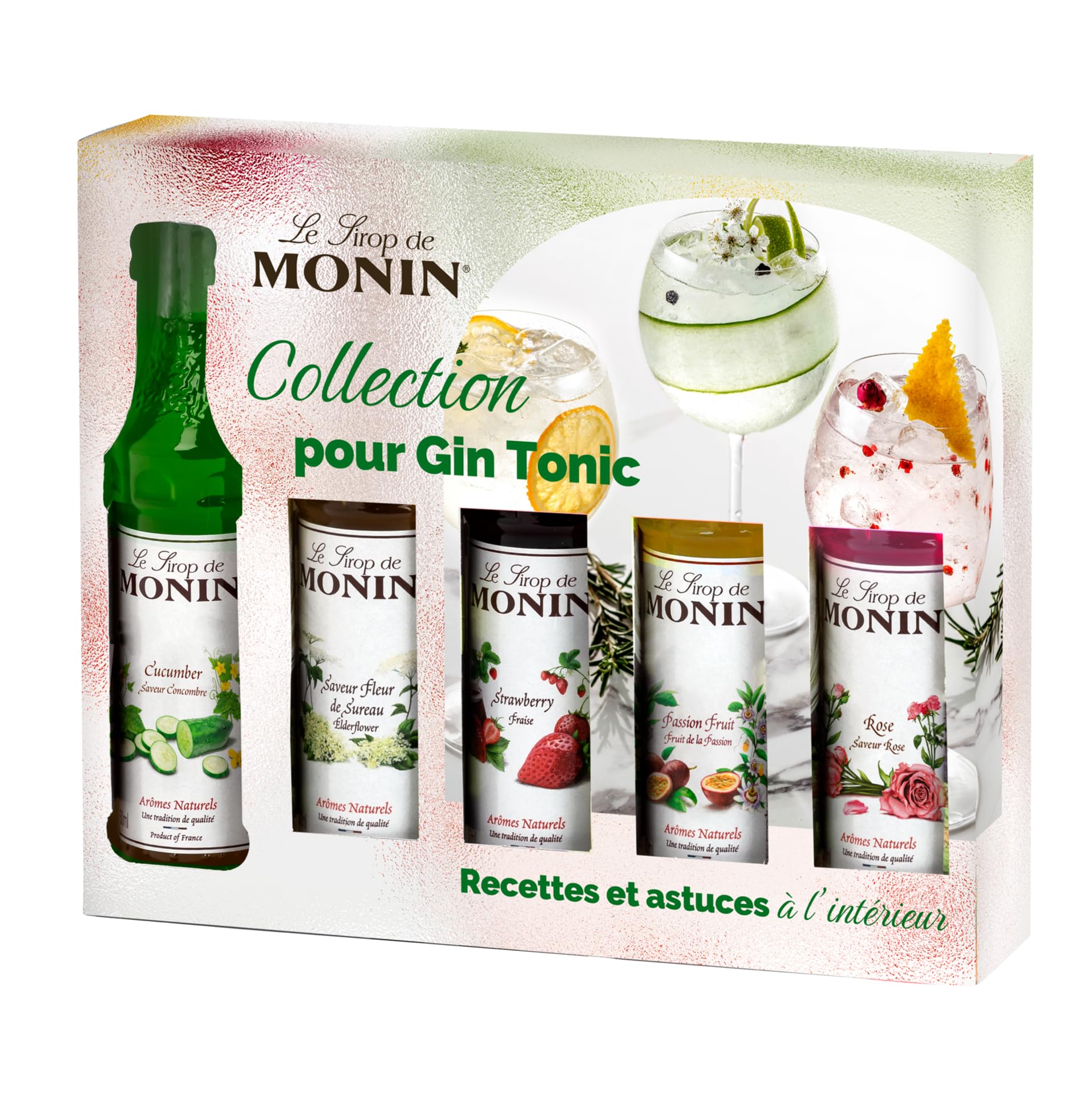 MONIN - Coffret Sirop MONIN Pour Gin Tonic Saveurs Rose Fleur de Sureau Fraise Fruit de la Passion Concombre - Pour Cocktail Avec ou Sans Alcool - Arômes Naturels - Bouteille en Verre - 5 x 5 cl