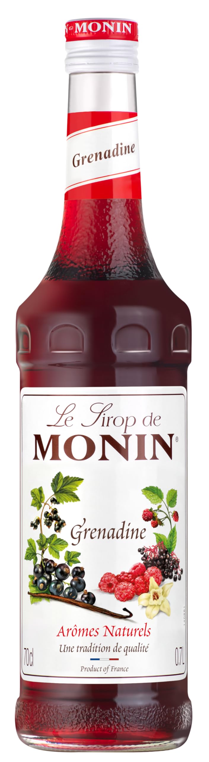 Made in France, natural flavors, vegan, recyclable glass bottle. RECIPE IDEA: Grenadine Diabolo: 20 ml MONIN Syrup, 200 ml lemonade - Pour the MONIN syrup into a glass filled with ice cubes - Add the lemonade and stir - Garnish and serve. NATURAL FLAVORS - Ideal for making mocktails, mojitos, cocktails, and flavoring your water and sodas. MONIN Grenadine syrup is a subtle blend of the sweetness of vanilla and the tartness of red berries.FABRICATION FRANCAISE, arômes naturels, vegan, bouteille en verre recyclable. IDEE RECETTE Diabolo Grenadine : 20 ml de Sirop MONIN, 200 ml de limonade - Verser le sirop MONIN dans un verre rempli de glaçons - Ajouter la limonade et mélanger - Décorer et servir. AROMES NATURELS - Idéal pour réaliser Mocktails, Mojitos, Cocktails et aromatiser votre eau et vos sodas. Le sirop MONIN Grenadine est un subtil mélange entre la rondeur de la vanille et l'acidité des baies rouges.MONIN - Sirop de Grenadine pour boissons fraîches et cocktails - Arômes naturels - 70 cl