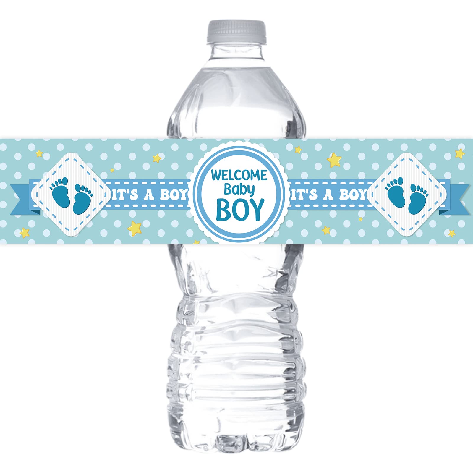 MonMon & Craft Welcome Baby Boy Water Bottle Stickers / Gender Reveal Bottle Wrappers / It's a Boy Water Labels Supplies / Baby Shower Decorations Blue ( Set of 32 )