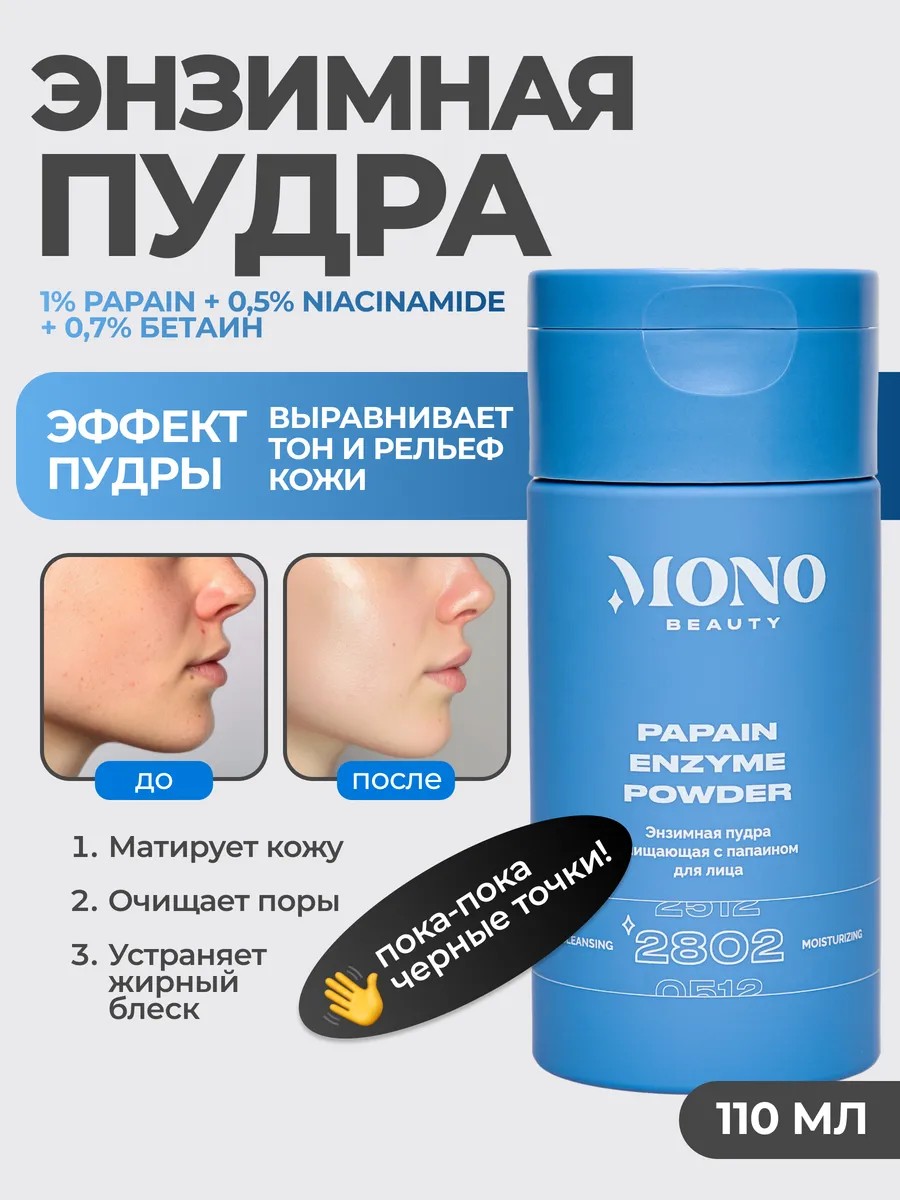 Регулярное использование энзимной пудры помогает предотвратить появление чёрных точек, прыщей и других несовершенств кожи. Кроме того, энзимная пудра подготавливает кожу к дальнейшему уходу, улучшая проникновение активных компонентов кремов и сывороток.