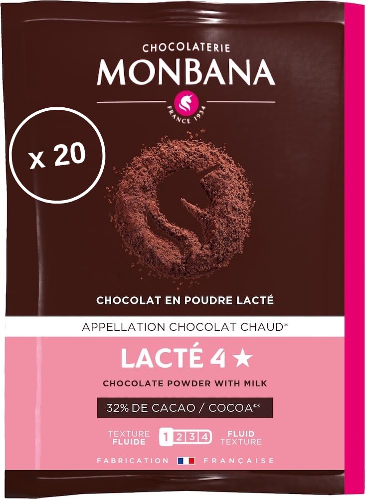 A delicious hot chocolate Simple and quick to prepare, this 4-star milk chocolate powder makes a light cup with the rich taste of milk chocolate. This mix, made in France, is prepared with French milk. Ingredients: Sugar, cocoa powder (32 ), skimmed milk powder (38.5 ), anti-caking agent E551, salt, flavorings. May contain traces of cereals containing gluten, eggs, nuts, celery, sulfites, and lupin. Instructions: Pour the contents of the sachet into a large cup or mug. Add hot water. Stir well to combine. Enjoy! MONBANA A French family business founded in 1934, three generations of chocolate enthusiasts have enabled Chocolaterie MONBANA to become one of the most creative in its sector. A long-established specialist in hot chocolate powder, Chocolaterie MONBANA has successfully diversified and now offers a collection of over 350 specialties that explore chocolate in all its forms: to drink, to nibble, to savor, to cook with, to give as a gift, or to treat yourself. NUTRITIONAL INFORMATION INGREDIENTS Sugar, cocoa powder (32 ), skimmed milk powder (38.5 ), anti-caking agent E551, salt, flavorings. INSTRUCTIONS FOR USE Pour the contents of the sachet into a large cup or mug, add hot water, stir well to combine, and enjoy. SAFETY WARNING Contains allergens. Do not consume if you are allergic to cereals containing gluten, eggs, nuts, celery, sulfites, or lupin. Dilute with hot water before consuming. See moreMonbana - Chocolat Monbana Lacté 4 Étoiles - 20 x 30gDESCRIPTION DU PRODUIT DESCRIPTION DU PRODUIT Un délicieux chocolat chaud Simple et rapide à préparer, le chocolat en poudre lacté 4 étoiles donne une tasse légère au bon goût de chocolat au lait. Cette préparation made in France est élaborée avec du lait d'origine française. Ingrédients: Sucre, cacao en poudre (32 ), lait écrémé en poudre (38,5 ), antiagglomérant E551, sel, arômes. Traces éventuelles de céréales contenant du gluten, oeufs, fruit à coques, céleri, sulfites et lupin. Mode d'emploi: versez le contenu du sachet dans une grande tasse ou un mug ajoutez de l'eau chaude remuez pour bien mélanger la préparation dégustez MONBANA Société familiale française née en 1934, ce sont trois générations de passionnés de chocolat qui ont permis à la Chocolaterie MONBANA de devenir lune des plus créatives de son secteur. Spécialiste historique du chocolat en poudre, la Chocolaterie MONBANA a su se diversifier avec succès et propose aujourdhui une collection de plus de 350 spécialités qui explorent le chocolat sous toutes ses formes : à boire, à croquer, à déguster, à cuisiner, à offrir ou à soffrir INFOS NUTRITIONNELLES INGRÉDIENTS Sucre, cacao en poudre (32 ), lait écrémé en poudre (38,5 ), antiagglomérant E551, sel, arômes. MODE D'EMPLOI Verser le contenu du sachet dans une grande tasse ou un mug, ajouter de l'eau chaude, remuer pour bien mélanger la préparation, déguster. AVERTISSEMENT DE SÉCURITÉ Contient des allergènes. Ne pas consommer si vous êtes allergique aux céréales contenant du gluten, aux oeufs, aux fruits à coques, au céleri, aux sulfites et au lupin. Diluer avec de l'eau chaude avant de consommer. Voir plus