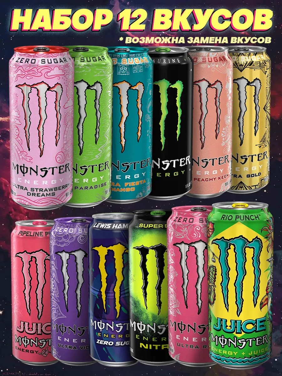 Monster Energy energy drink will give you a boost of energy and a surge of energy throughout the day. The product's ingredients are safe and pose no health risks, but it is not recommended for children. This 10-piece mix will satisfy a variety of tastes. This carbonated drink is produced in Europe and imported to Russia from the Netherlands. Made in the Netherlands, the products are exclusively imported and comply with all product declarations and inspections. Canned energy drinks are convenient and easy to pack in a backpack for hiking or train travel. Monster Energy is a great way to surprise a loved one or co-worker; it comes in a variety of flavors not found on regular store shelves. Our line also includes sugar-free energy drinks, perfect after an intense workout or while working on muscle tone. We offer a variety of berry and fruit flavors: Ultra Blue, Lewis Hamilton, Yellow Ripper, Ultra Fiesta Mango, Mixxd Punch, Ginger Mule, Pacific Punch, Pipeline Punch, Ultra Paradise, Ultra Violet, Ultra Zero, Nitro, and Ultra Gold. This energizing product comes in high-quality 500 ml cans, making it easy to take on the go. This delicious energy drink has a pleasant aroma that varies depending on the flavor. Sugar-free cans are also included. This fortified carbonated drink with a unique formula is suitable for both men and women. Monster Energy energy drink is low in calories and suitable even for those on a low-calorie diet. This non-alcoholic drink contains purified water, sugar, dextrose, acidity regulators, taurine, ginseng extract, caffeine, various botanicals, vitamins, and flavorings. This delicious energy drink will appeal to everyone—young people, students, gamers, those engaged in intense physical activity, and adults who need to maintain high energy levels. This imported drink, not available in Russian stores, is a perfect gift for a best friend, close friend, coworker, classmate, or sister or brother. This drink mix is an indispensable addition to any festive table for a birthday, anniversary, wedding, New Year's, Christmas, or any family celebration. It's an excellent choice for those who don't like alcoholic cocktails but still want to feel energetic. You can take a can of this drink with you on trips, to work, to university, on out-of-town trips, to sporting events, picnics, and even to dance, sports, and fitness classes. This delicious and healthy drink will delight and surprise everyone! We have special offers and sales, and you can buy our products as gifts at a discount!