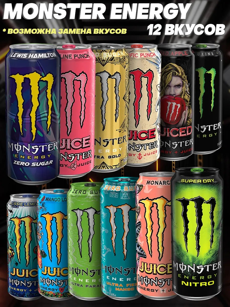 Monster Energy energy drink will give you a boost of energy and a surge of energy throughout the day. (FLAVOR SUBSTITUTIONS ARE POSSIBLE, as this is an imported product). The product's ingredients are safe and pose no health risks, but it is not recommended for children. This 10-piece mixed drink set will satisfy a variety of tastes. This carbonated drink is produced in Europe and imported to Russia from Holland. All products are imported and comply with all product declarations and inspections. Canned energy drinks are convenient and easy to pack in a backpack for hiking or train travel. Monster Energy is a great way to surprise a loved one or co-worker; it comes in a variety of flavors not found on regular store shelves. Our line also includes sugar-free energy drinks, perfect after an intense workout while working on muscle tone. This delicious energy drink has a pleasant aroma that varies depending on the flavor. The set also includes cans of sugar-free drinks. A vitamin-enriched carbonated drink with a unique formula is suitable for both men and women. Monster Energy is low in calories and suitable even for those on a low-calorie diet. This non-alcoholic drink contains purified water, sugar, dextrose, acidity regulators, taurine, ginseng extract, caffeine, various botanicals, vitamins, and flavorings. This delicious energy drink will appeal to everyone—young people, students, gamers, those engaged in intense physical activity, and adults who need to maintain high energy levels. This imported drink, not available in Russian stores, is a perfect gift for a best friend, close friend, coworker, classmate, or sister or brother. This drink mix will be an indispensable part of a festive table for a birthday, anniversary, wedding, New Year, Christmas, or any family celebration. It's an excellent choice for those who don't like alcoholic cocktails but want to feel energetic. You can take a can of this drink with you on trips, to work, to university, on out-of-town trips, to sporting events, picnics, and even to dance, sports, and fitness classes. This delicious and healthy drink will delight and surprise everyone! We have special offers and sales, and you can buy our products as gifts at a discount!