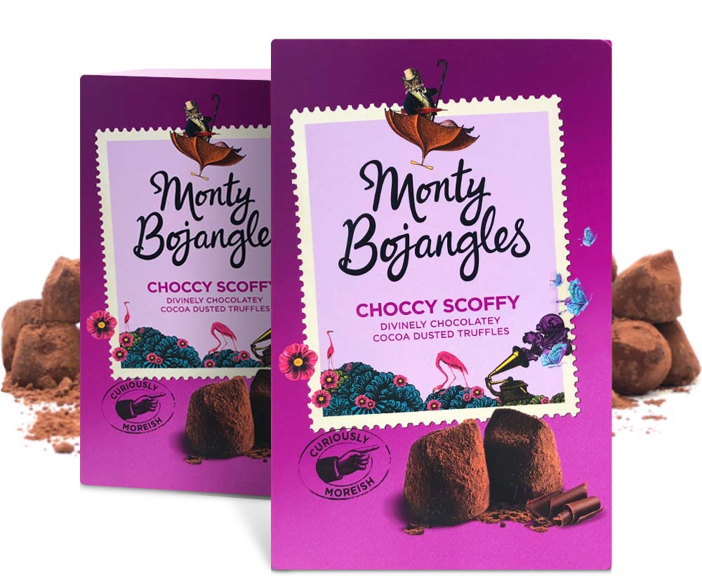 A chocoholic dream! The truffles inside are our original rich and chocolatey truffles covered with a generous dusting of exquisite bitter cocoa powder. This is truly a chocoholic dream truffle recipe that won a Great Taste Award in 2018. Packaging: Each of this set of 2 gift boxes is made from premium folding cardboard, printed inside and out, with a glossy and matte finish that is luxurious to see and touch. The gift boxes are filled with individually wrapped, award-winning Monty Bojangles truffles in brightly colored foil packaging. There are over 42 cocoa-dusted truffles in these 2 gift boxes. Each gift box measures just under 11 cm wide, 8.5 cm deep, and 17 cm high. These truffles are suitable for vegetarians. About us: Monty Bojangles is a British confectionery brand based in London, famous for its award-winning cocoa-dusted truffles. Our cocoa-dusted truffle varieties have won 38 Great Taste Awards. We are proud to say they are the tastiest truffles in the UK. We have created a range of unique, delicious, and beautifully designed gift boxes, family sharing packs, and tasting pouches for you, your friends, and your family to enjoy together (if you're in the mood to share!). Our truffles are made with a unique and delicious recipe carefully crafted to deliver the most indulgently chocolatey experience imaginable. We dust our truffles with exquisite bitter cocoa powder and infuse their centers with delicious ingredients and inclusions that add depth, texture, and unforgettable flavor to every curiously rich bite. INGREDIENTS Vegetable oils (coconut, palm kernel) 43.5 , sugar 32.7 , reduced cocoa powder 13.4 , whey powder (from milk) 8.9 , cocoa powder 1 , emulsifier (soy lecithin) 0.5 INSTRUCTIONS Indulge yourself occasionally See moreMonty Bojangles Choccy Scoffy Lot de 2 boîtes cadeau de 200 gDESCRIPTION DU PRODUIT DESCRIPTION DU PRODUIT Un rêve chocoholic! Les truffes à l'intérieur sont nos truffes originales riches et chocolatées recouvertes d'un généreux saupoudré de poudre de cacao amère exquise. Ce sont vraiment une recette de truffe de rêve chocoholic qui a remporté un prix Great Taste Award en 2018. Emballage : chacun de ce lot de 2 boîtes cadeaux est fabriqué en carton pliable de qualité supérieure, imprimé à l'intérieur et à l'extérieur, avec une finition brillante et mate qui est luxueuse à voir et au toucher. Les boîtes cadeaux sont remplies de truffes primées Monty Bojangles emballées individuellement dans un emballage métallique aux couleurs vives. Il y a plus de 42 truffes poussiérées de cacao dans ces 2 boîtes cadeaux. Chaque coffret cadeau mesure un peu moins de 11 cm de large, 8,5 cm de profondeur et 17 cm de haut. Ces truffes conviennent aux végétariens. À propos de nous : Monty Bojangles est une marque de confiserie britannique basée à Londres célèbre pour ses truffes saupoudrées de cacao primées. Nos variétés de truffes saupoudrées de cacao ont remporté 38 Great Taste Awards. Nous sommes fiers de dire qu'ils sont la plus savoureuse truffe au Royaume-Uni Nous avons créé une gamme de boîtes cadeaux uniques délicieuses et superbement belles, de paquets de partage de famille et de pochettes à goûter pour vous et vos amis et votre famille pour profiter ensemble (si vous avez envie de partager). ). Nos truffes sont fabriquées avec une recette unique et délicieuse soigneusement conçue pour offrir l'expérience chocolatée la plus indulllement imaginable. Nous saupoudrons nos truffes avec de la poudre de cacao amère exquise et infusons leurs centres de truffe avec de délicieux ingrédients et inclusions qui ajoutent de la profondeur, de la texture et de la saveur inoubliable à chaque bouchée curieusement plus INGRÉDIENTS Huiles végétales (noix de coco, noyau de palme) 43,5 , sucre 32,7 , poudre de cacao réduite 13,4 , poudre de lactosérum (à partir de lait) 8,9 , poudre de cacao 1 , émulsifiant (lécithine de soja) 0,5 MODE D'EMPLOI Faites-vous plaisir occasionnellement Voir plus