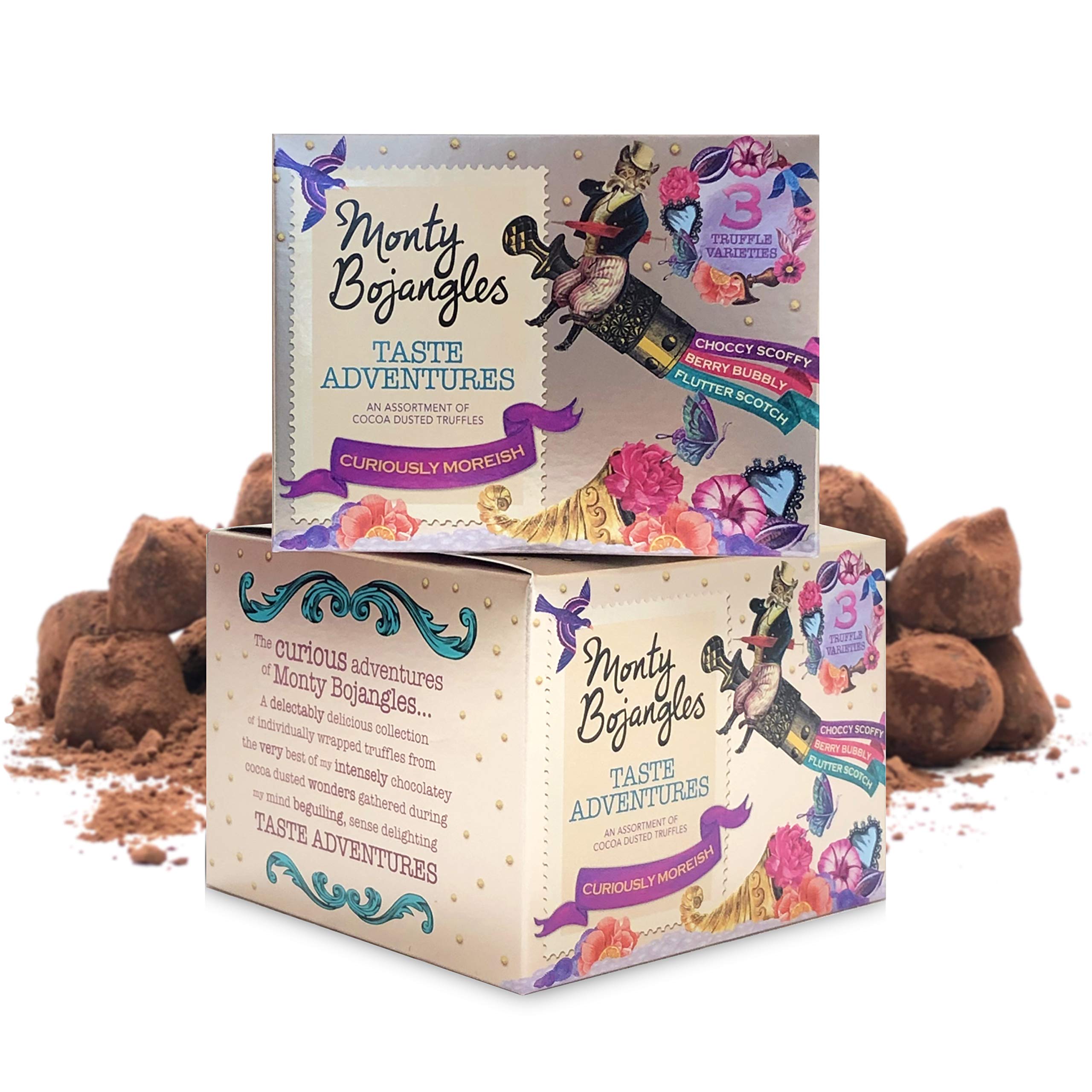 The Monty Bojangles Fine confectioners of London scour the globe for exquisite and exotic chocolate and confectionery delicacies for their bon vivant fans. After all, great thoughts come from the stomach – "Great thoughts come from the stomach!" A team of madcap creators, designers, chocolatiers, and marketing hats, all led by the head cat in charge, stuff as they do with nothing more than civilized haste through the world of chocolate, sweets, and treats, creating inventions for your enjoyment from the finest and most naturally delicious confectionery the world has ever seen. Monty Bojangles Taste Adventures 3 Truffle Variety Pack. An assortment of different Monty Bojangles cocoa-dusted truffles. Contains: Choccy Scoffy, Berry Bubbly, Flutter Scotch. INGREDIENTS Vegetable oils (coconut, palm kernel), sugar, fat-reduced cocoa powder, whey powder (from milk), caramel chips (2 ) (sugar, glucose syrup, cream (milk), skimmed milk powder, salted butter (butter (milk), sea salt), popping candies (2 ) (sugar, lactose (milk), cocoa butter, glucose syrup, carbon dioxide), cocoa powder, emulsifier (soy lecithin), natural flavoringMonty Bojangles Taste Adventures Assortiment de boîtes à bijoux en poudre de cacao 2 x 135 gDESCRIPTION DU PRODUIT DESCRIPTION DU PRODUIT Les confiseurs Monty Bojangles Fine de Londres explorent le monde à la recherche de délicieuses friandises exquises et exotiques au chocolat et à la confiserie pour leurs amateurs de bon viveur. Après tout, les grandes pensées viennent de l'estomac - « Les grandes pensées viennent de l'estomac ! ». Une équipe de créateurs, de designers, de chocolatiers et de chapeaux de marketing fous, tous dirigés par le chat principal en charge rembourrage comme ils le font avec rien de plus que de la hâte civilisée à travers le monde du chocolat, des bonbons et des friandises créant des inventions pour votre plaisir à partir des confiseries les plus fines et les plus naturellement délicieuses que le monde ait jamais vues Variété de truffes Monty Bojangles Taste Adventures 3. Un assortiment de différentes truffes saupoudrées de cacao de Monty Bojangles. Contient : Choccy Scoffy, Berry Bubbly, Flutter Scotch. INGRÉDIENTS Huiles végétales (noix de coco, palmiste), sucre, poudre de cacao réduite en graisse, poudre de lactosérum (à partir du lait), chips de caramel (2 ) (sucre, sirop de glucose, crème (lait), lait écrémé en poudre, beurre salé (beurre (lait), sel de mer), bonbons à éclater (2 ), (sucre, lactose (lait), cacao a Beurre, Glucose Sirop, dioxyde de carbone), poudre de cacao, émulsifiant (lécithine de soja), arôme naturel