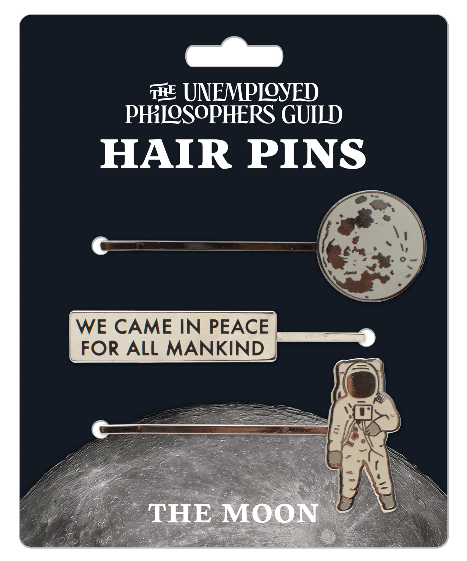 Moon 3 Hair Pins Set - Planet Astronaut and Apollo 11 Plaque Quote