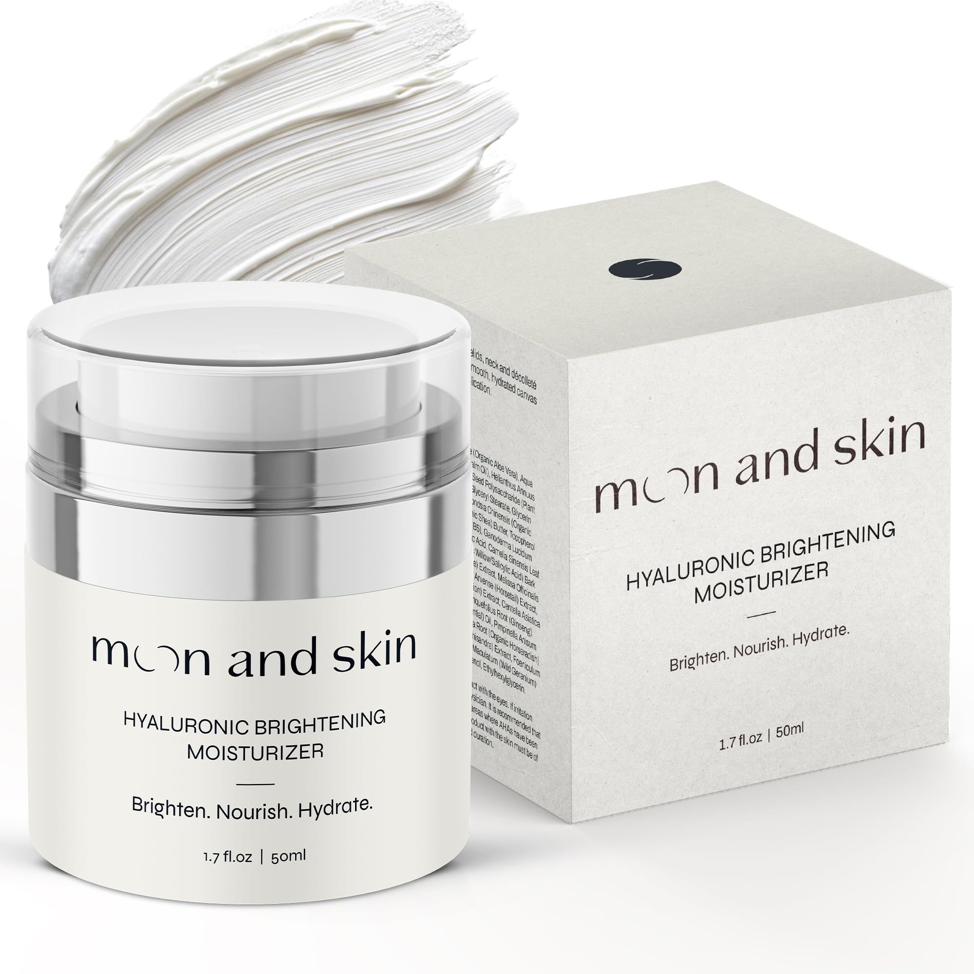 Transform your skincare routine with Moon and Skin's Hyaluronic Brightening Moisturizer, a luxurious formula designed for face, eyelids, neck, and décolleté. This versatile moisturizer combines the power of Hyaluronic Acid and Kojic Acid to deliver deep hydration while evening skin tone. The carefully curated blend of organic extracts, including Aloe Vera, Green Tea, and Gotu Kola, works in harmony with Vitamins B5 and E to nourish and rejuvenate your skin. Perfect for all skin types, this lightweight moisturizer creates an ideal canvas for makeup application while promoting a naturally radiant complexion. The formula enriched with organic Jojoba Oil and Shea Butter helps maintain skin's moisture balance, while botanical extracts like Licorice and Lemon Balm contribute to a brighter, more luminous appearance. Apply morning and night to experience the transformative benefits of this advanced skincare solution.Airless Pump for Fresh Feel Potency: Innovative airless pump packaging protects formula from air exposure, ensuring freshness, potency, and zero contamination with every use. No waste, no mess—just a clean, smooth application. Made in the USA with Clean, High-Quality Ingredients: Crafted in the USA using responsibly sourced, clinically clean ingredients. Free from harsh chemicals, artificial fragrances, parabens, and sulfates. Trusted by professionals and safe for daily use. Gentle Daily Moisturizer for All Skin Types: Safe and effective for all skin types, including acne-prone, oily, sensitive, and combination. Non-comedogenic and dermatologist-tested. Use morning and night on face, neck, and under eyes. Anti-Aging Superfoods Botanical Extracts: Packed with antioxidant-rich botanicals like green tea, reishi, gotu kola, ginseng, and vitamin E to support skin elasticity, smooth fine lines, and protect against visible signs of aging. Deep Hydration with Hyaluronic Acid Antioxidants: This lightweight cream moisturizer uses multi-weight hyaluronic acid, organic aloe, jojoba, and green tea to deliver deep, long-lasting hydration. Helps plump fine lines and restore moisture barrier. Brightening Moisturizer for Radiant, Even Skin: Formulated with Kojic Acid, licorice root, and organic botanicals to reduce dark spots, improve uneven tone, and restore dull, tired skin. Reveals a visibly brighter, glowing complexion.