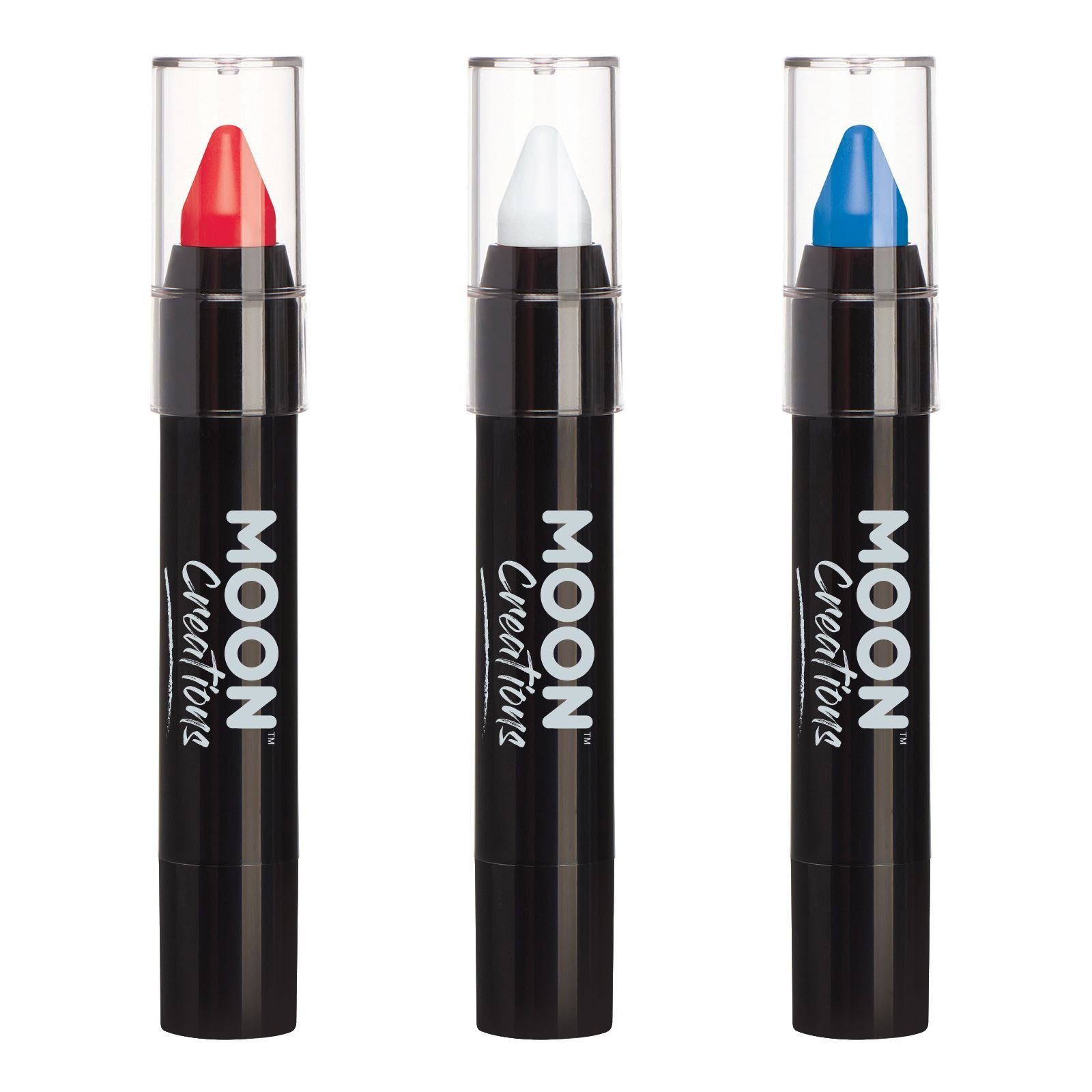 READY TO USE, EASY APPLICATION: No water needed—our body crayons and face paint are super easy to apply directly to your face or body—no mess and no skills required! Simply remove with makeup remover wipes. FOR ALL SKILL LEVELS AND OCCASIONS: From beginner to makeup pro, Moon Creations has your next look covered, whether it's a superhero, cartoon character, animal, fairy, or a costume for events like Halloween or Easter. PREMIUM QUALITY, LONG-LASTING: Our premium wax crayons are sweat and water resistant, so expect excellent, long-lasting coverage with every application. Your creation will last all day (or night!). BODY CRAYONS FOR FACE PAINTING FOR KIDS AND ADULTS: Master the world of face painting with Moon Creations' ready-to-use body crayons for children's parties, festivals, themed parties and more!Moon CreationsCrayon de corps de bâton de peinture de visage Pour enfants, adultes, festival, Halloween, bleu, blanc, rouge, 3,2 gPRÊT À L'EMPLOI, APPLICATION FACILE : Pas besoin d'eau - nos crayons pour le corps et notre peinture pour le visage sont très faciles à appliquer directement sur votre visage ou votre corps - pas de gâchis et aucune compétence requise ! Retirez-le simplement avec des lingettes démaquillantes. POUR TOUS LES NIVEAUX DE COMPÉTENCES ET OCCASIONS : Du débutant au professionnel du maquillage, Moon Creations couvre votre prochain look, qu'il s'agisse d'un super-héros, d'un personnage de dessin animé, d'un animal, d'une fée ou d'un costume pour des événements comme Halloween ou Pâques. QUALITÉ SUPÉRIEURE, LONGUE DURÉE : Nos crayons de cire haut de gamme sont résistants à la sueur et à l'eau, alors attendez-vous à une excellente couverture durable à chaque application. Votre création durera toute la journée (ou la nuit !). CRAYONS POUR LE CORPS POUR LA PEINTURE POUR LE VISAGE POUR ENFANTS ET ADULTES : Maîtrisez le monde de la peinture pour le visage avec les crayons pour le corps prêts à l'emploi de Moon Creations pour les fêtes d'enfants, les festivals, les soirées à thème et plus encore !.