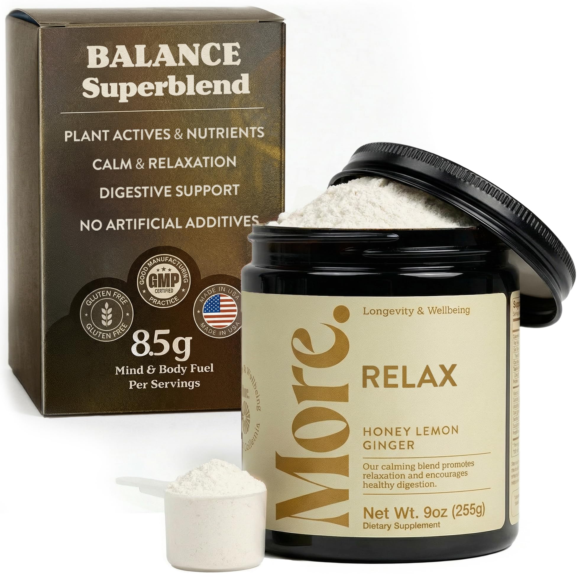 Rooted in Wellbeing – More. Longevity Wellbeing creates science-led wellness blends that merge natural adaptogens and functional nutrients. Relax Blend is designed to support calm, focus, and everyday balance with integrity and clarity. Clean Label Integrity Third-Party Tested – Made without artificial additives, fillers, or unnecessary excipients. Manufactured in a GMP-certified facility and third-party tested for purity, safety, and consistency, reflecting More.'s commitment to clean, trustworthy wellness blends. Clean Ingredients with Functional Nutrients – Naturally flavored with honey granules, lemon juice powder, and monkfruit extract, this ashwagandha for women and men blend combines adaptogens, calming botanicals, prebiotics, and essential vitamins and minerals to support overall wellbeing and gut harmony. Thoughtfully Crafted, Generous Serving Size – Each 255g jar provides 30 servings of a balanced calming drink mix. The formula features functional nutrients such as GABA, L-Theanine, 5-HTP, ginger root extract, prebiotic fiber, essential vitamins, and magnesium, supporting relaxation and digestive comfort in a single serving. Gentle Functional Calm – This soothing blend supports emotional ease, nervous system balance, and digestive comfort. Key ingredients include Ashwagandha extract, Passion Flower, Chamomile extract, Ginger Root extract, GABA, L-Theanine, 5-HTP, and prebiotic inulin, carefully combined for steady, functional calm.