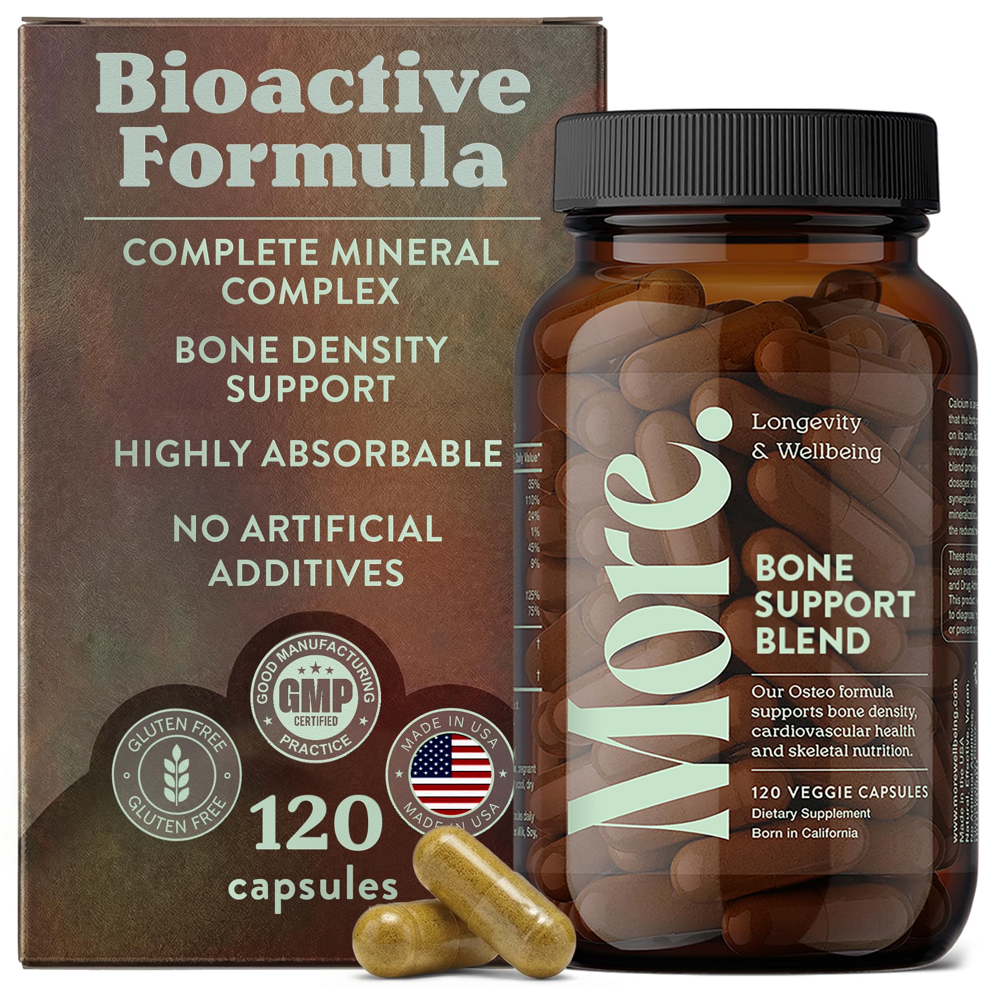 ABOUT MORE. LONGEVITY WELLBEING – We create vitamins with a focus on clean-label purity, potency, and science-backed results. Our goal is to help you build a foundation of strength, health, and vitality with supplements you can trust. MADE IN THE USA – Carefully crafted in the USA under strict quality standards, this gluten-free formula provides daily support for healthy bones and joints. Simply take 4 capsules daily to help maintain your bone health. PREMIUM INGREDIENTS – Our high-absorption calcium blend is combined with trace minerals and vitamins to optimize bone strength and maintain structural integrity. Every batch is third-party tested to ensure purity, safety, and consistency. COMPLETE, SCIENCE-BACKED FORMULA – Each serving delivers essential minerals and nutrients that work together to support bone health, mineral density, and overall wellness. Designed with clean label integrity, it contains no artificial additives, fillers, or unnecessary excipients. ADVANCED BONE SUPPORT – This isn't just a calcium supplement. Our formula combines microcrystalline hydroxyapatite calcium with Vitamin D3, Vitamin K2 (MK7), magnesium, zinc, manganese, and boron to support bone mineralization, density, and structural integrity. MK7 helps guide calcium into bones where it belongs, promoting long-term bone strength and joint support.