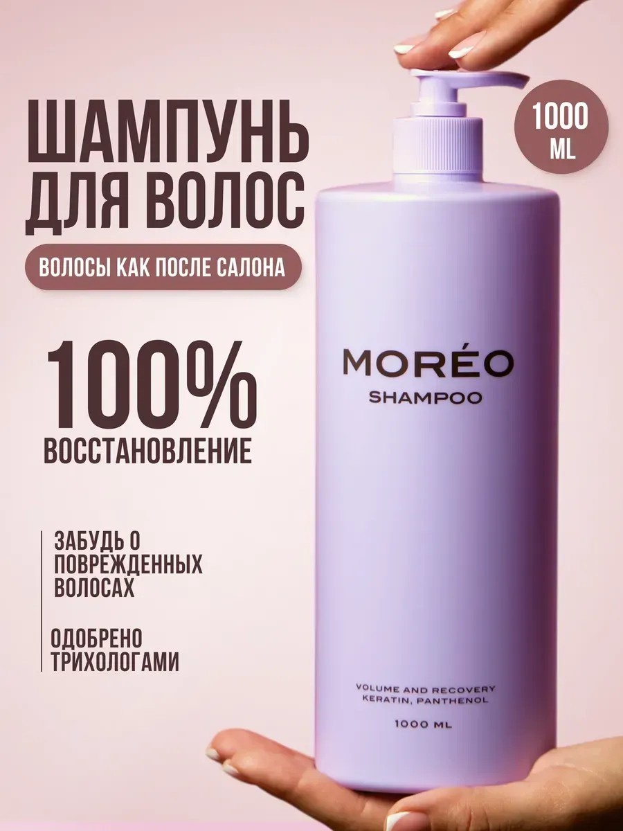 MOREO's deep cleansing shampoo for all hair types thoroughly cleanses oily scalps and hair from root to tip, adding long-lasting volume and thickening hair without weighing it down. Its balanced pH and lactic acid formula prevent drying and irritation. Suitable for normal, oily, and dry hair, as well as damaged, bleached, colored, and highlighted hair, this shampoo leaves hair shiny, nourished, and smooth after just one use. This moisturizing and restorative 1000 ml shampoo will be appreciated by blondes and women with curly and wavy hair, as it will leave curls more manageable. Professional Shampoo is suitable for daily use by the whole family, including men and women, as well as teenagers. Its formula helps restore hair structure from within, thickening hair, and restoring its smoothness and elasticity. D-Panthenol (Vitamin B5) prevents dandruff, dehydration, and breakage. It protects hair from split ends during heat styling and has an anti-static effect. The results of using this shampoo include a healthy scalp, incredible volume, easy combing without tangling, and thick, shiny hair along the entire length. This is hair care at home. This professional cosmetic product is the perfect birthday gift for your beloved wife or girlfriend.