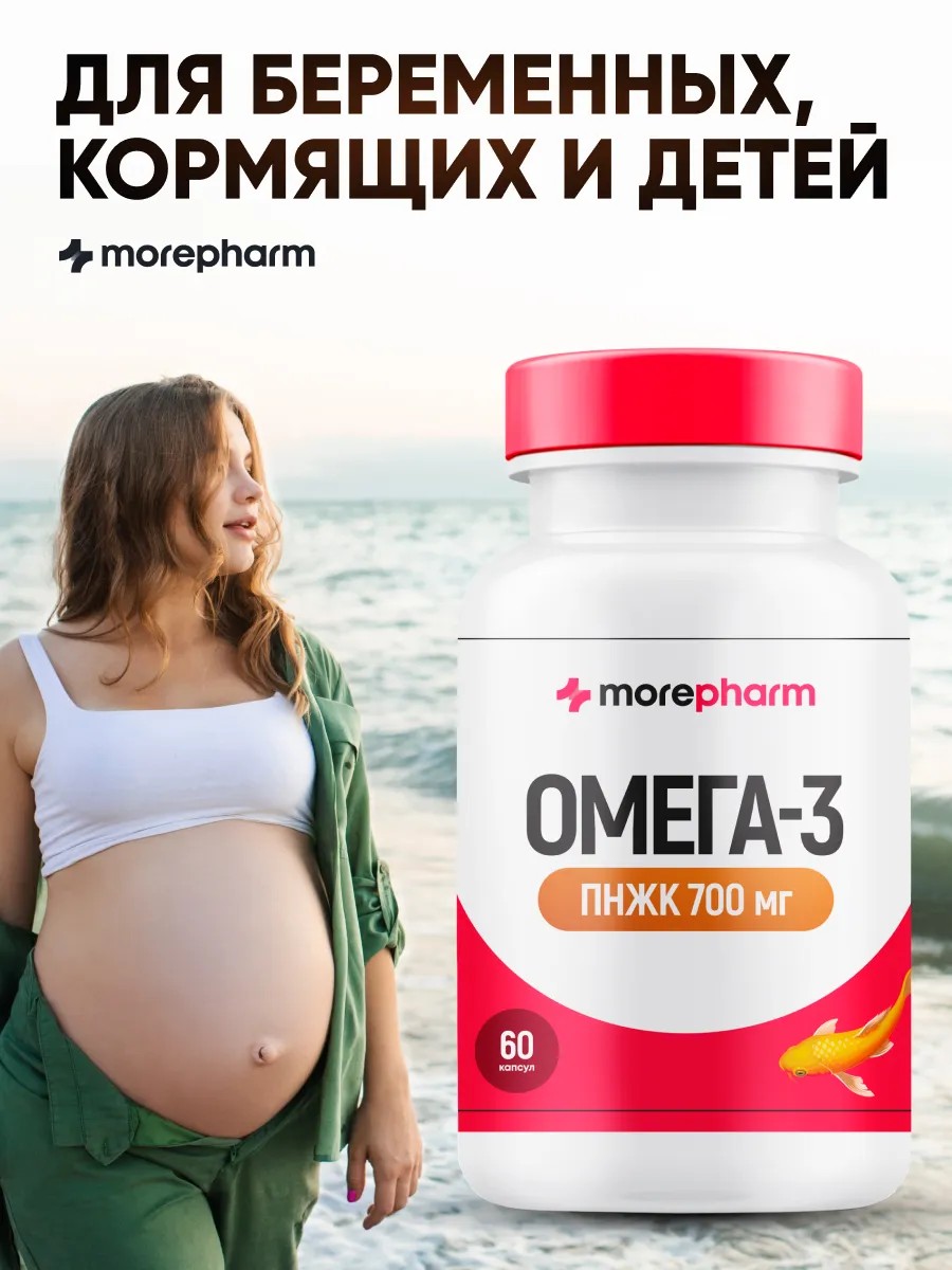 Витамины для беременных женщин комплекс Омега 3 - 35% от Морефарм производится из высококачественного рыбьего жира с высоким содержанием полиненасыщенных жирных кислот EPA и DHA. Дозировка ПНЖК 700 мг. Разрешена беременным, кормящим и детям с 11 лет.