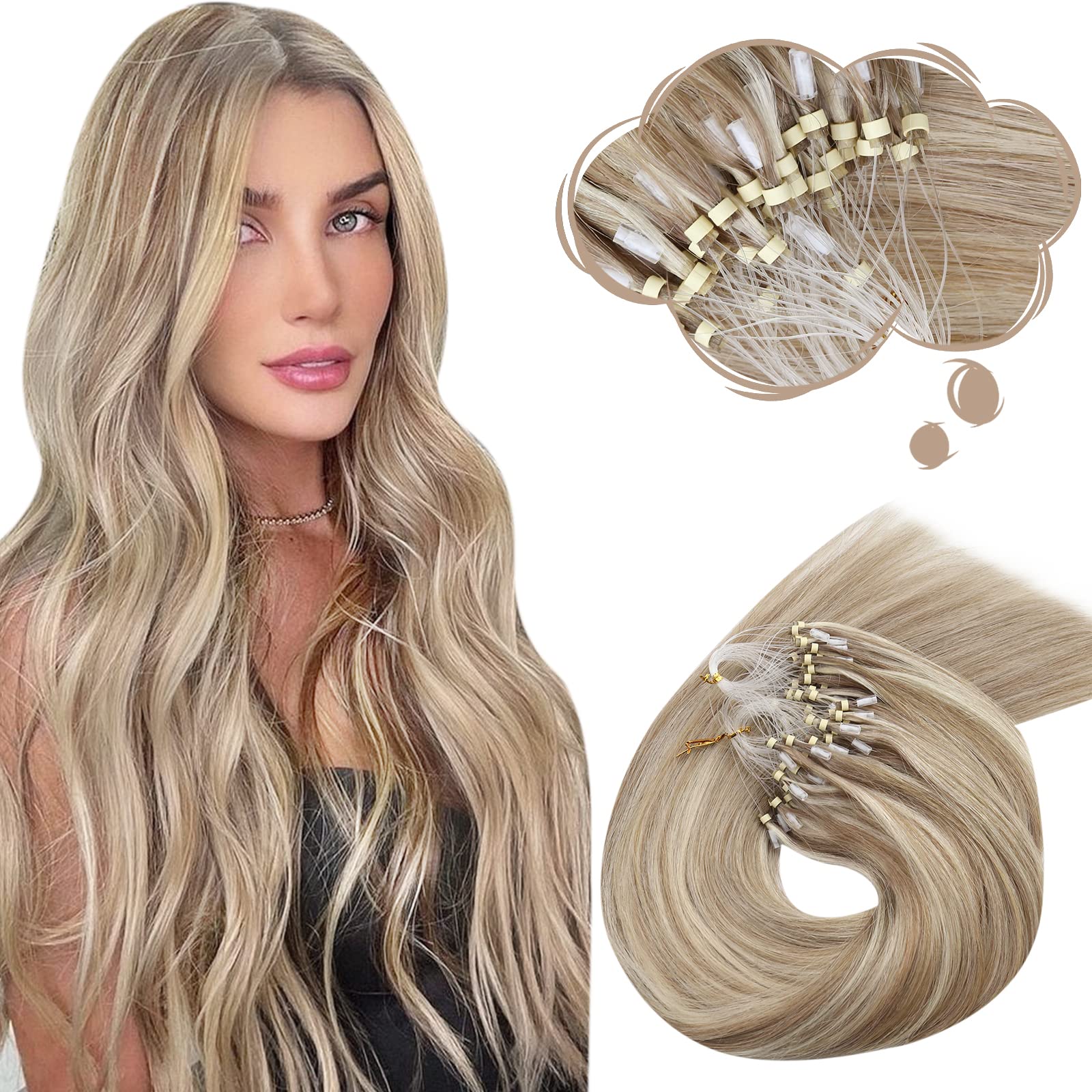 Moresoo Extensions Microring Echthaar 1g Cold Fusion Micro Ring Extensions Blond Strähnen 60cm Remy Haarverlängerung Echthaar Microrings Dicke Haare 9A 60 Hellbraun mit Platinblond 50g 60 cm 1.Microring P9A 60