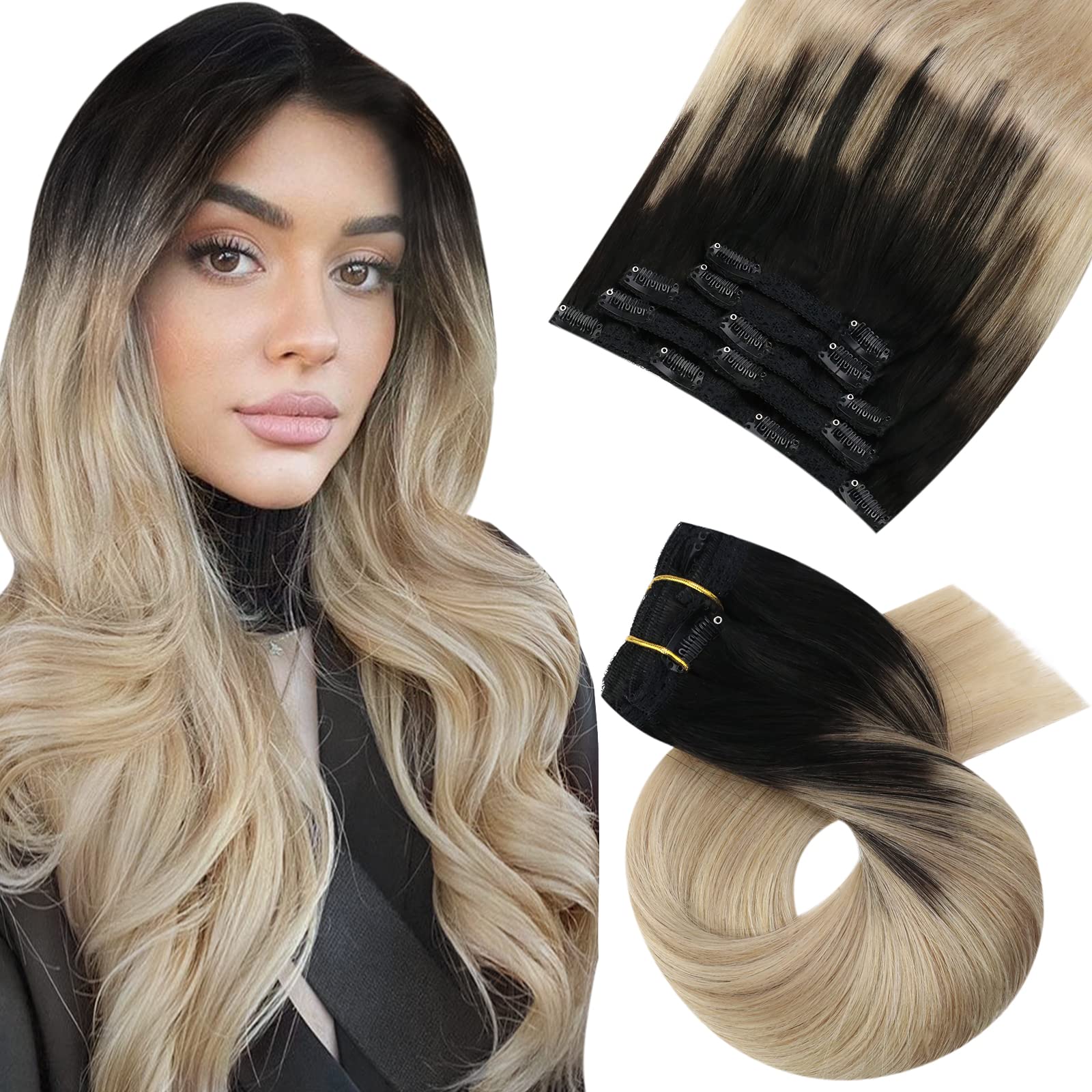 Moresoo Hair Extensions Clip in Real Hair 16 Inch Clip in Human Hair Extensions Natural Black to Ash Blonde with Platinum Blonde Clip in Extensions Remy Hair Silky Thick 7 Pieces/120g #1B/18/60 40 cm #1B/18/60