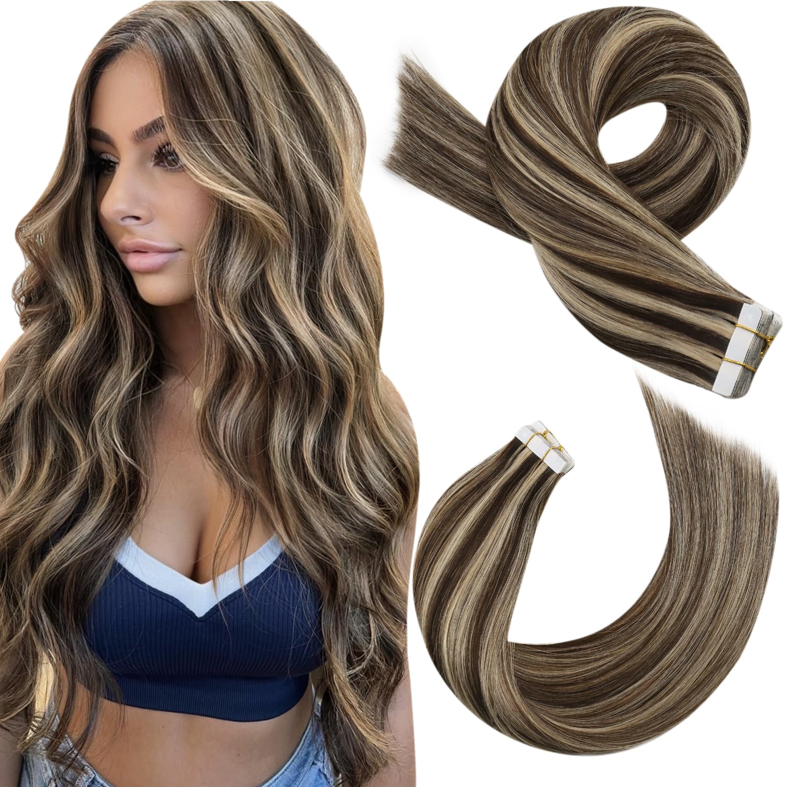 Moresoo Human Hair Extension Tape in Highlight Brown and Blonde Real Hair Tape in Extensions 20 Inch Tape in Real Human Hair Extensions 20 Pieces/50g #P4/27 20 Inch #P4/27