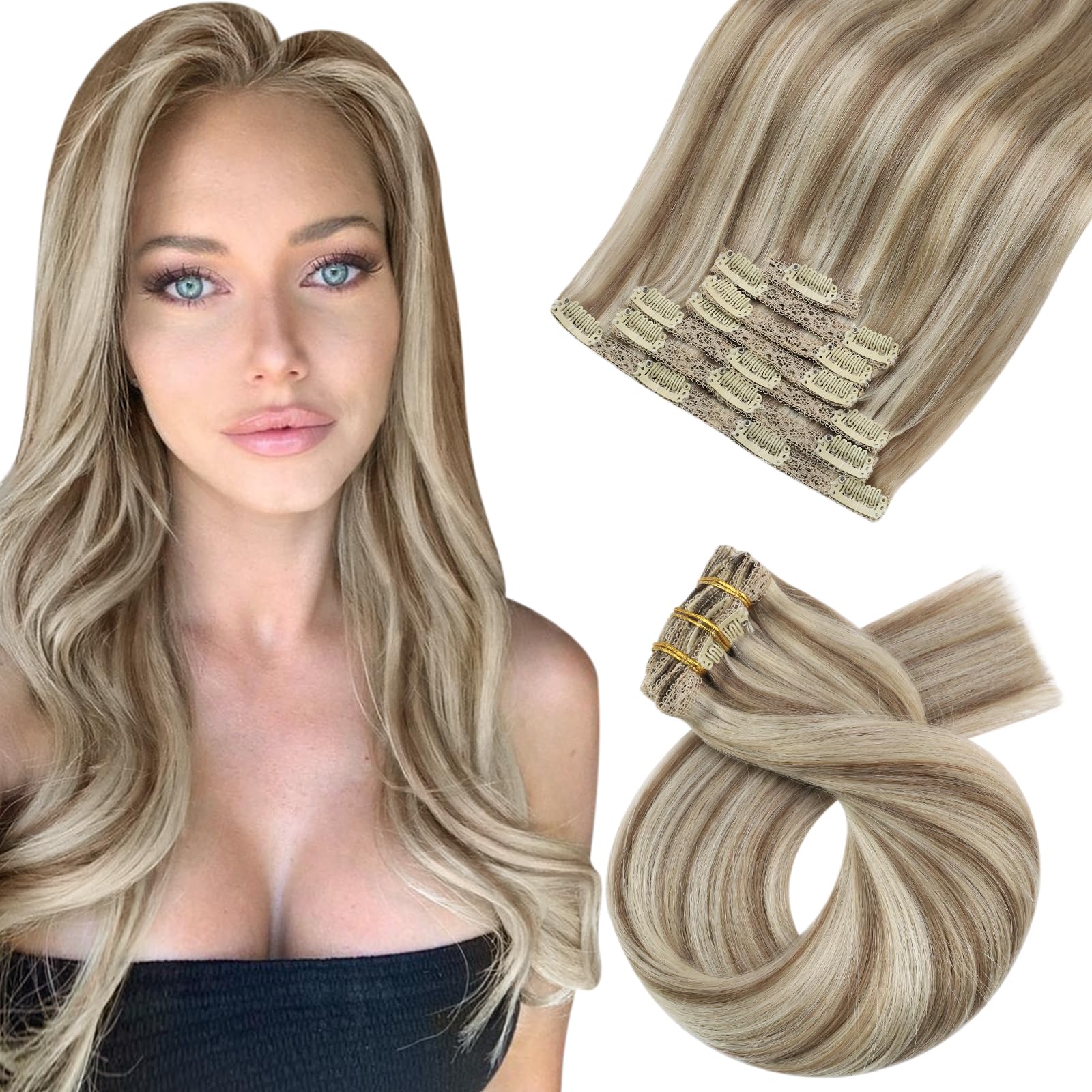 Moresoo Human Hair Extensions Clip in 18 Inch Real Hair Clip in Hair Extensions Light Brown with Platinum Blonde Clip in Real Hair Extensions 18 Inch 7 Pieces/120g #9A/60 45 cm #9A/60