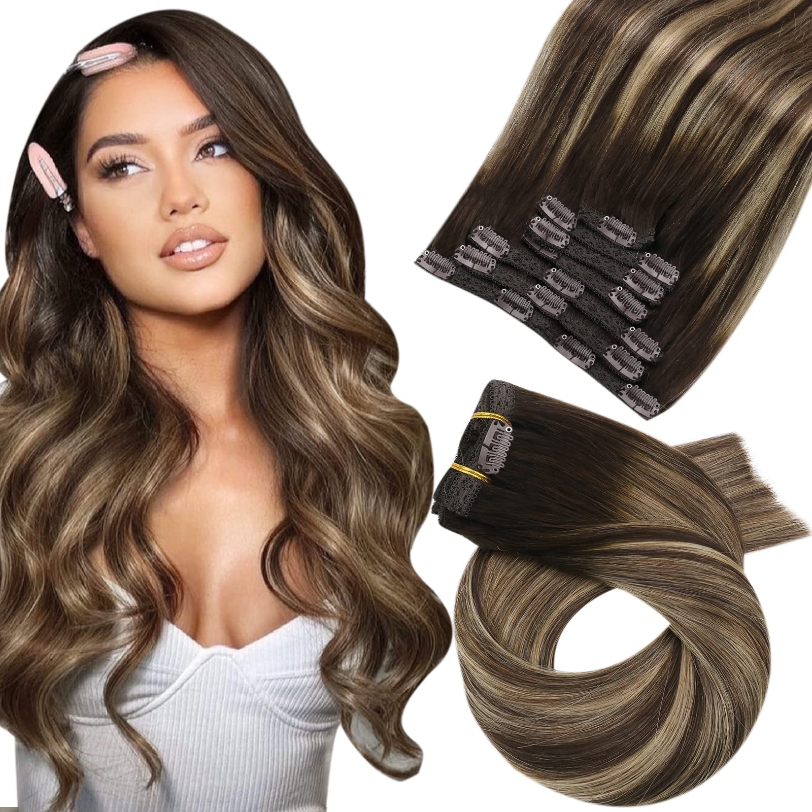 Moresoo Human Hair Extensions Clip in Balayage Real Hair Clip in Hair Extensions Dark Brown and Caramel Blonde Clip in Human Hair Extensions 20 Inch 7 Pieces/120g #4/27/4 50 cm #4/27/4