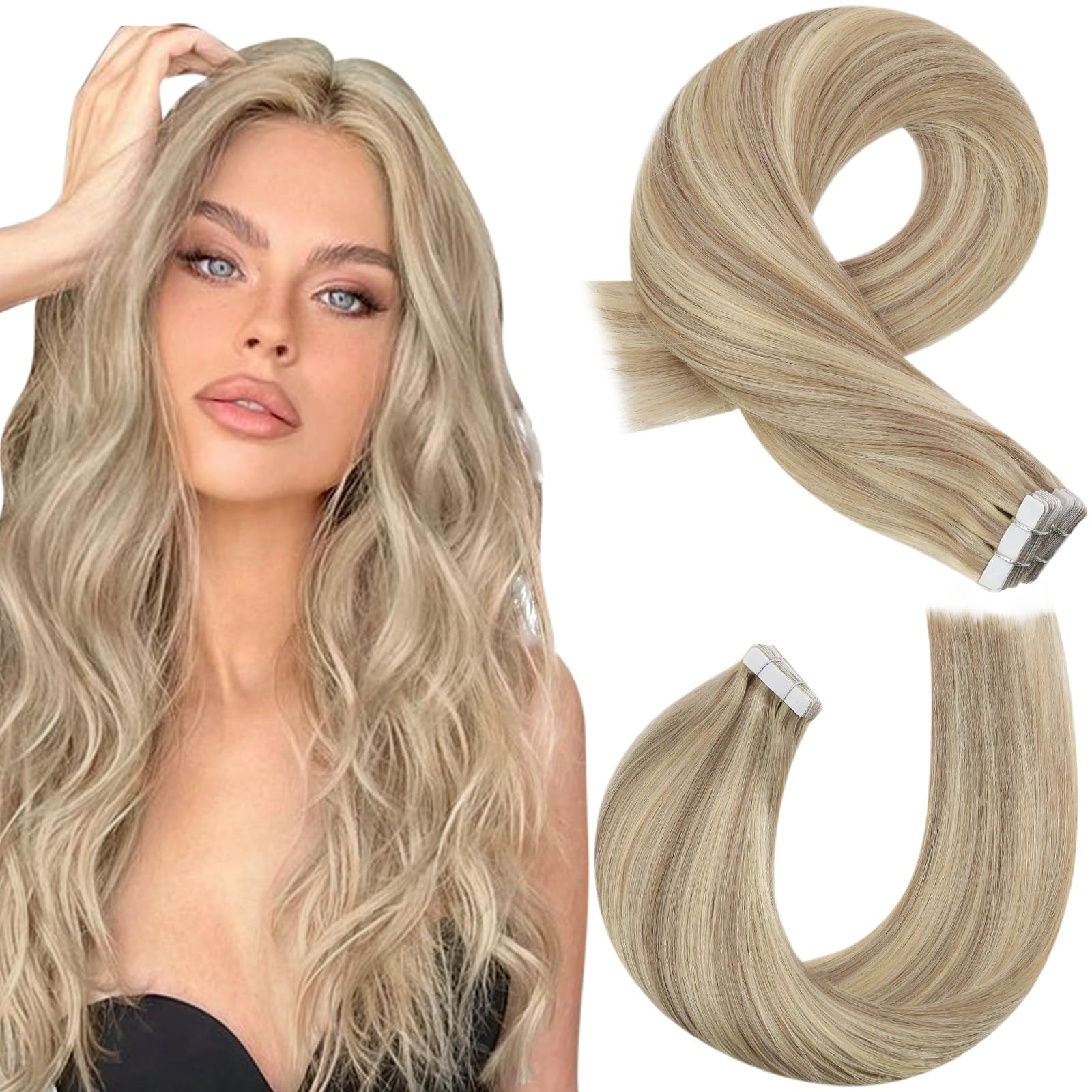 Moresoo Tape in Extensions Blond Haarverlängerung Blonde Echthaar Tapes Goldblond mit Mittelblond Tape Extensions Echthaar 45 cm Seidig Gerade 20 Stück 50g/Pack #P16/22 45 cm 1.#P16/22