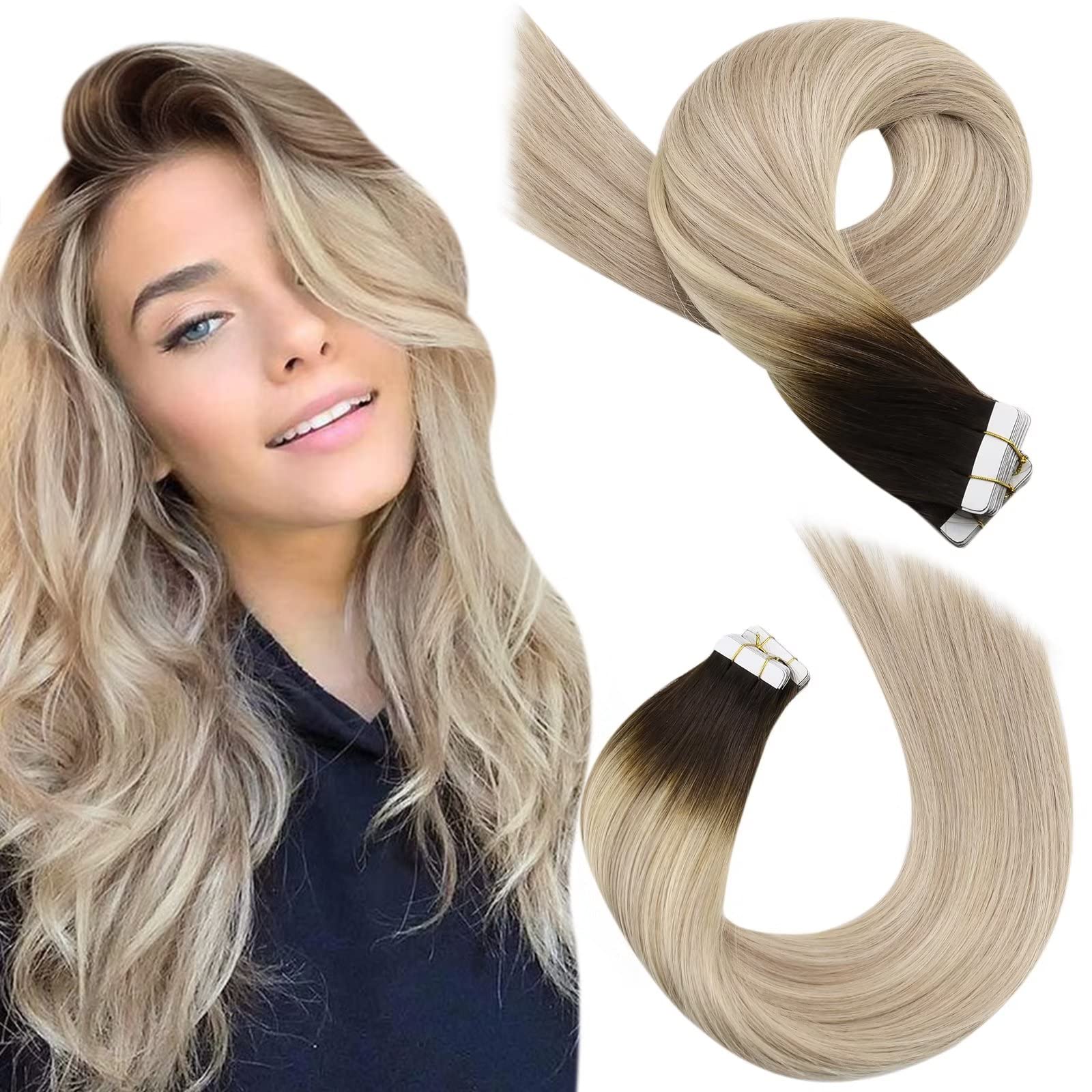 Moresoo Tape in Human Hair Extensions Real Hair Tape in Extensions Brown Root Ombre to Golden Blonde with Platinum Blonde Hair Extensions Human Hair Tape in 14 Inch 20 Pcs/50g #3/12/613 14 Inch #3/12/613