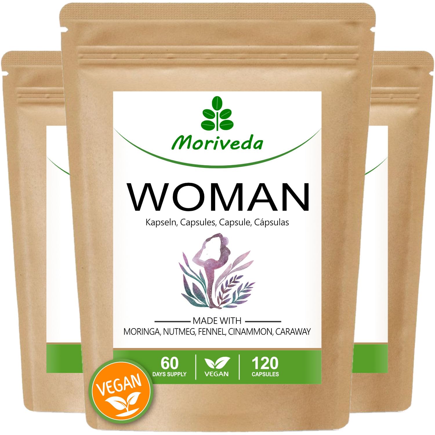 Moringa Woman capsules 500mg especially for women cycle balance menopause 6 months supply moringa cinnamon caraway fennel nutmeg natural and vegan 360 pieces by MoriVeda