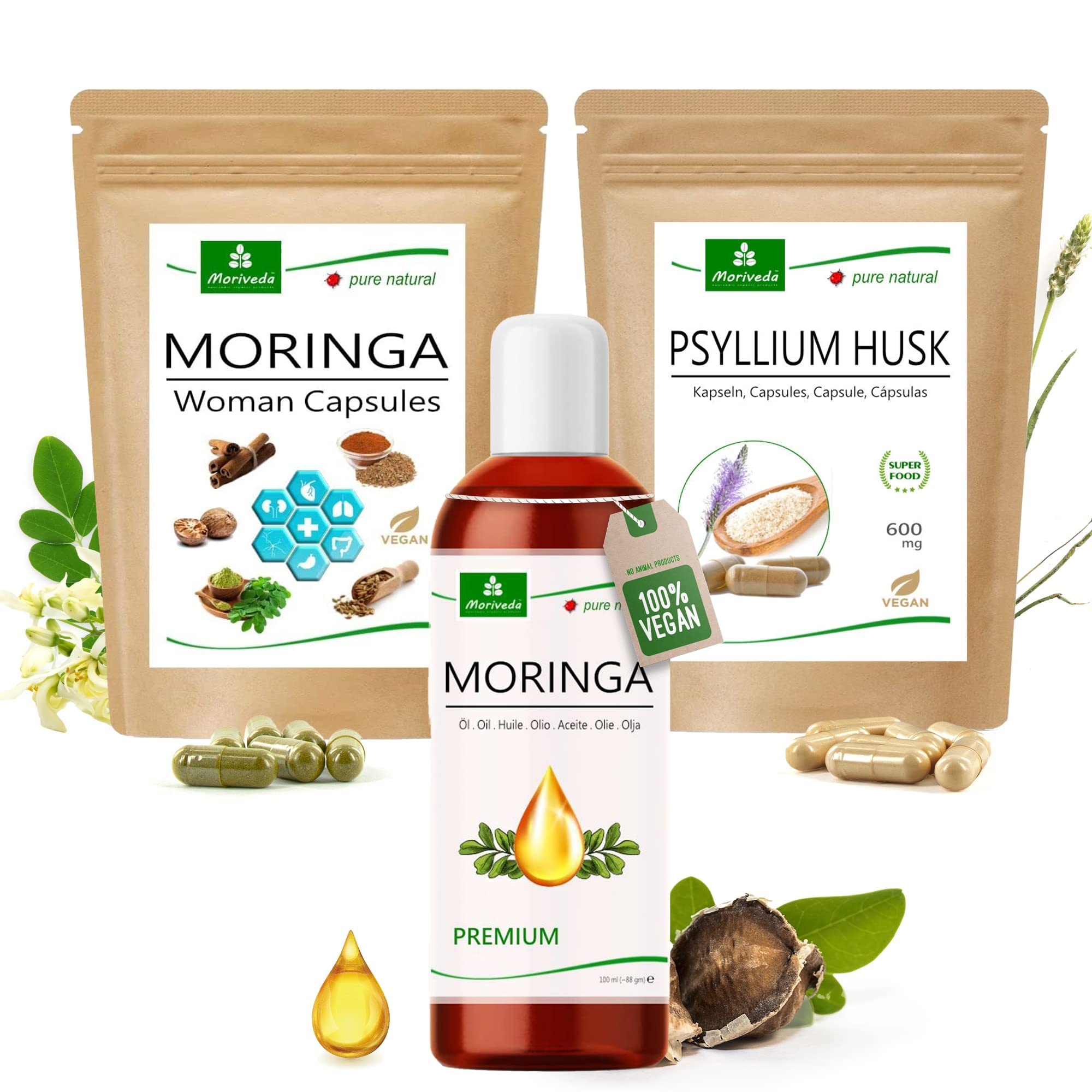 MoriVeda Frauenpower Produktpaket für Frauen, Psyllium Husk Kapseln, Moringa Woman Kapseln, Moringa Premium Öl, reich an Vitaminen, Mineralien und Antioxidantien