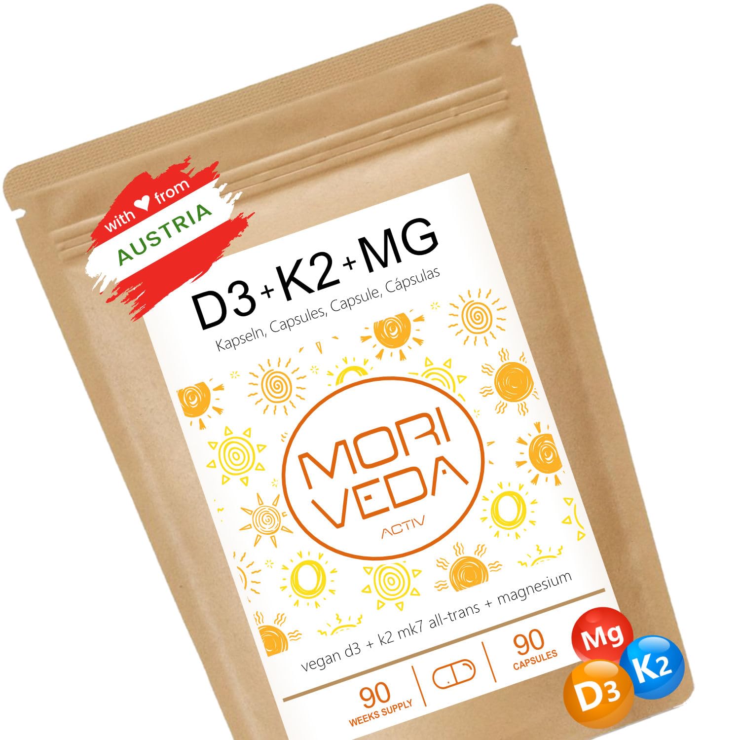 PRODUCT SPECIFICATIONS: Contains 90 vegan capsules for approximately 90 weeks of use. Recommended intake: 1 capsule per week. Gluten-free, lactose-free, and GMO-free. MADE IN GERMANY: MoriVeda products are manufactured according to the strictest quality standards (GMP, HACCP, and DIN ISO 9001). You receive premium quality with tested ingredients. GOOD ABSORPTION: Magnesium dicitrate is particularly soluble and easily utilized by the body. Vitamin K2 MK-7 (99 all-trans) contributes to the maintenance of normal bones. LONG-LASTING SUPPLY: With just one capsule per week, you reliably supply your body with vitamin D3, K2, and magnesium – for up to 90 weeks. Weekly intake supports a regular supply without daily effort. 100 PLANT-BASED FORMULA: MoriVeda combines vitamin D3 from lichens (7000 IU) with vitamin K2 MK-7 (99 all-trans) and high-quality magnesium. This carefully balanced combination offers optimal absorption and maximum purity.SPÉCIFICATIONS DU PRODUIT : Contient 90 gélules véganes pour environ 90 semaines d'utilisation. Consommation recommandée : 1 gélule par semaine. Sans gluten, lactose ni OGM. FABRICATION EN ALLEMAGNE : Les produits MoriVeda sont fabriqués selon les normes de qualité les plus strictes (GMP, HACCP et DIN ISO 9001). Vous recevez une qualité premium avec des ingrédients testés. BONNE ABSORPTION : Le magnésium dicitrate est particulièrement bien soluble et facilement utilisable par l'organisme. La vitamine K2 MK-7 (99 tout-trans) contribue au maintien d'une ossature normale. RÉSERVE LONGUE DURÉE : Avec une seule gélule par semaine, vous fournissez à votre organisme de manière fiable de la vitamine D3, K2 et du magnésium – jusqu'à 90 semaines. La prise hebdomadaire soutient un apport régulier sans effort quotidien. FORMULE 100 VÉGÉTALE : MoriVeda combine de la vitamine D3 issue de lichens (7000 UI) avec de la vitamine K2 MK-7 (99 tout-trans) et du magnésium de haute qualité. Cette association soigneusement équilibrée offre une bonne absorption et une pureté maximale.MoriVeda Vitamine D3 K2 MK7 végane avec 7000 UI de D3 et 200 µg de K2 90 gélules Réserve hebdomadaire hautement dosée avec magnésium Fabriqué en Allemagne formule végétale