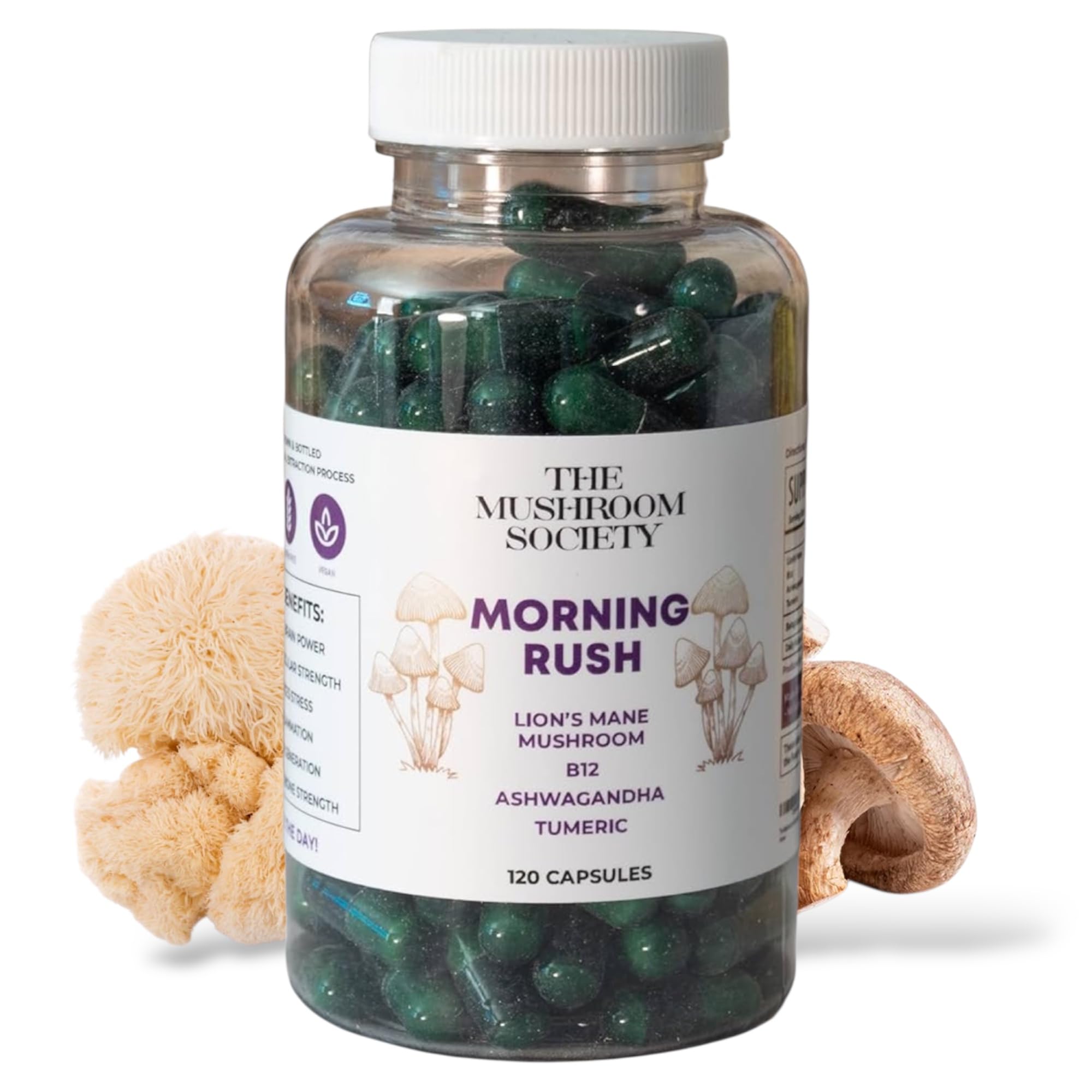 Morning Rush - Lion s Mane Ashwagandha Turmeric & B12 Extract Blend - Mushroom Supplement for Focus & Energy Support - 120 Vegan Capsules 120 Count (Pack of 1) Morning Rush