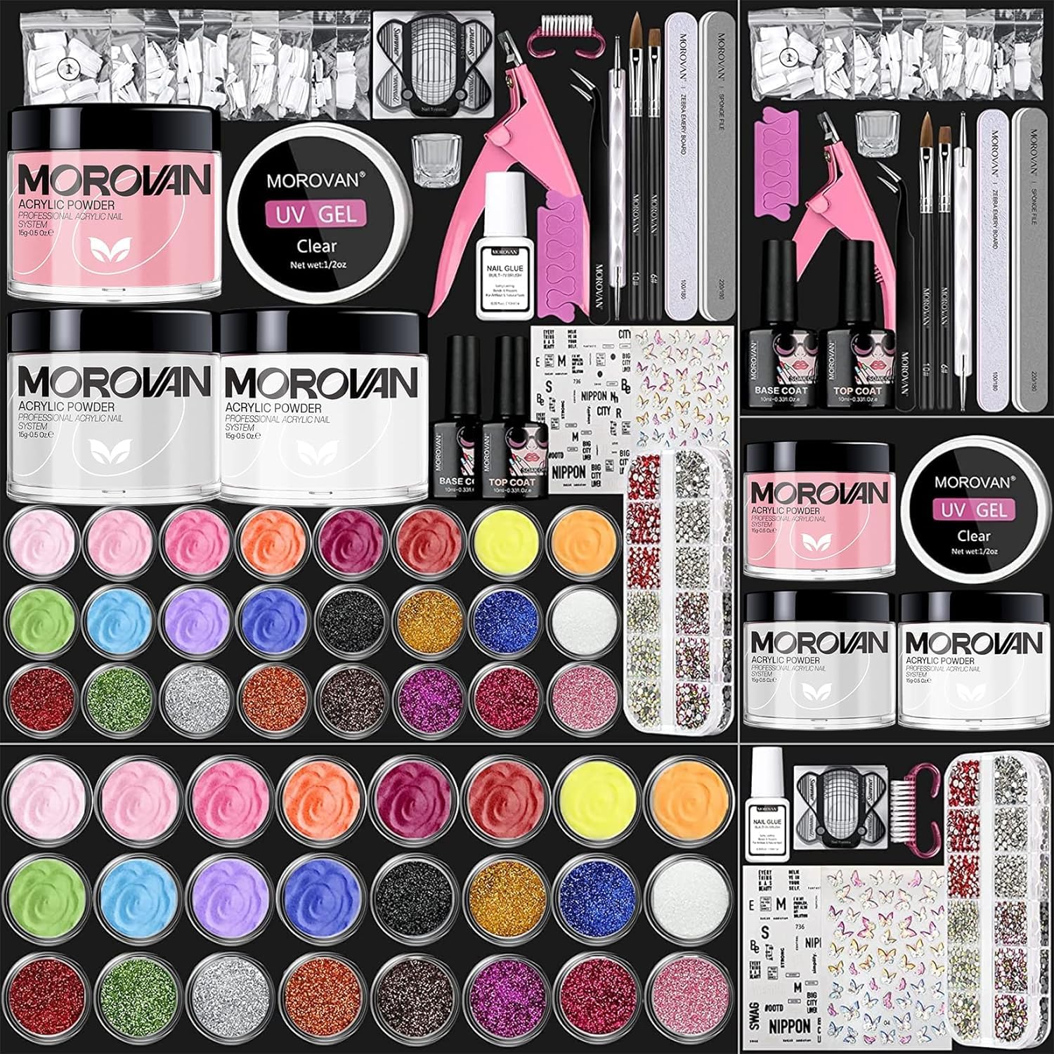 ??1V1 CUSTOMER SERVICE OF MOROVAN FULL ACRYLIC NAIL KIT: Bring your creativity to make stunning acrylic nails using this acrylic nail kit / acrylic powder set. If you have any questions with this acrylic nail kit acrylic powder set, please feel free to contact us, replacement and refund services are always available. We encourage you to share your nail ideas images! Enjoy your shopping~. ??NO NAIL LAMP NEEDED FOR MOROVAN COMPLETE ACRYLIC NAIL KIT: These acrylic powders don’t need to be cured by a nail lamp, avoid skin damage. It allows you to finish your acrylic nail art faster, instead of taking time to cure the nails after applying every layer. The acrylic nail included in this acrylic nail kit has a heavy odor, so a ventilated place is recommended to reduce the smell. ??3D HOLOGRAPHIC BUTTERFLY or LETTER NAIL ART STICKERS: The complete acrylic nail kit comes with a sheet of glitter butterfly sticker and a sheet of letter sticker, fun and gorgeous. These self-adhesive nail art stickers & decals pattern design incorporates popular elements, adding a touch to your natural nails, acrylic nails, gel nails, or other nail tips, perfect for fashionable women and trendy girls. ??GLITTER ACRYLIC NAIL POWDERS SET: The full acrylic nail kit comes with 3 basic colors (clear, white and pink) and 24 stunning colors glitter powders, developed with non-yellowing formula, bubble-free polymers, providing flawless consistency, superior adhesion, adding charming to your nail enhancements by mixing basic colors and glitters to create sparkling acrylic nail extensions, nail carving sculpting or other French nails. Optimized for all seasons. ??MOROVAN FULL ACRYLIC NAIL KIT WITH EVERYTHING: The nail kit set professional acrylic with everything you need to create acrylic nails, 24 colors glitter powders, 3 colors acrylic powder, acrylic nail, gel top base coat set, holographic butterfly stickers, nail tips and other basic nail art decoration accessories tools, ideal for both professional nail technician and DIY nail starter lover.