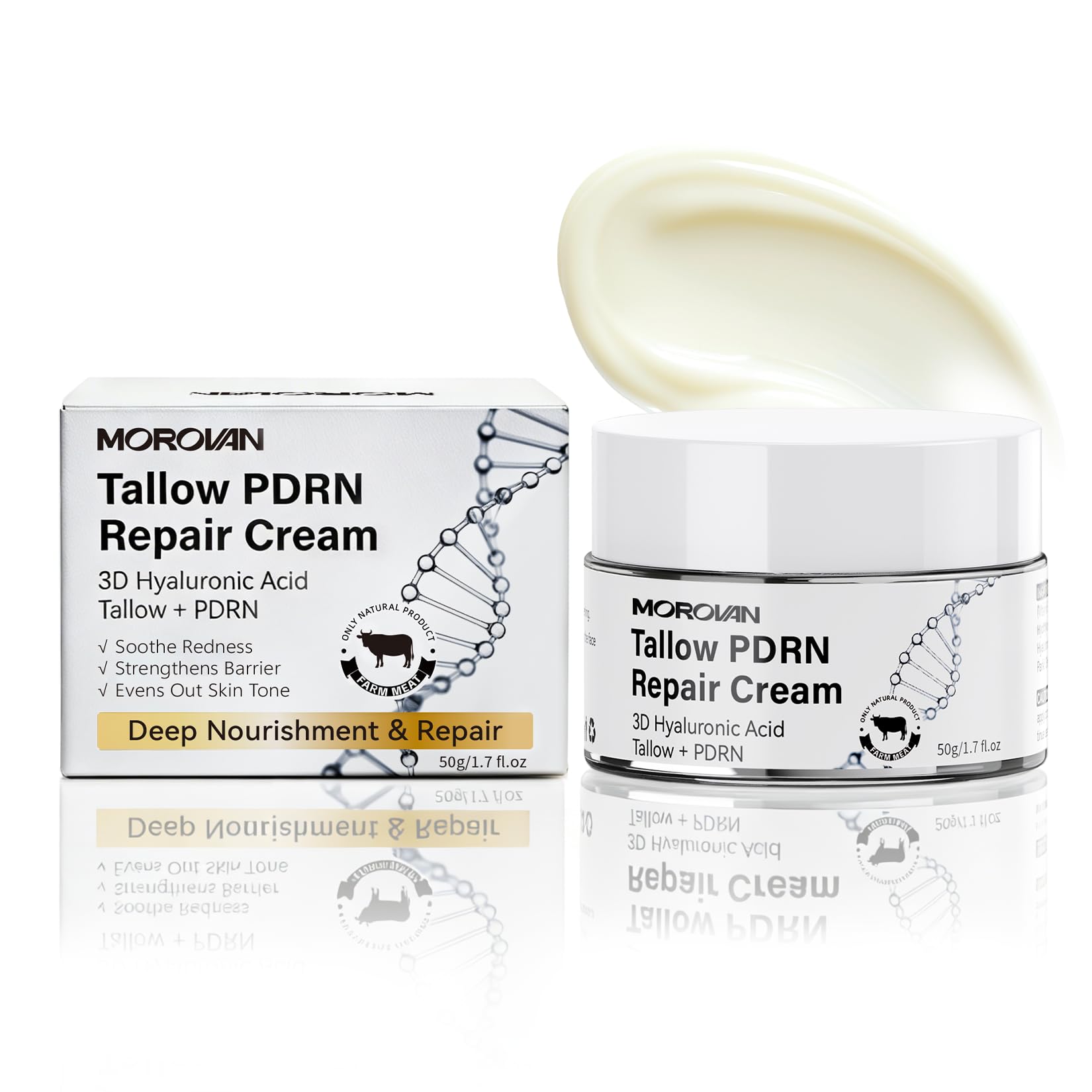 Experience deep skin restoration with MOROVAN Tallow PDRN Repair Cream. This rich facial moisturizer combines nutrient-dense natural tallow with regenerative PDRN and multi-depth 3D Hyaluronic Acid. It is scientifically formulated to intensely hydrate, strengthen a compromised skin barrier, and target visible signs of aging for a smoother, healthier-looking complexion.