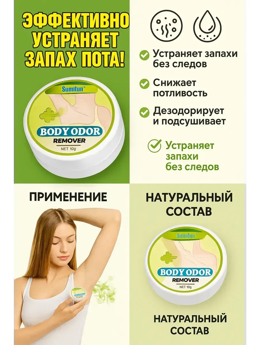 Эффективное средство против неприятного запаха тела — бальзам Sumifun Body Odor Remover на натуральной основе. Специально разработан для устранения избыточного потоотделения и нейтрализации резкого запаха в области подмышек, стоп, спины и интимной зоны. Компактный формат позволяет брать средство с собой и использовать в любой ситуации.