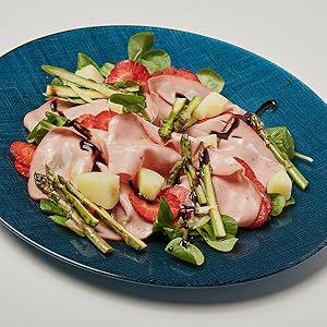 Pour la finition:Placez les tranches de mortadelle, les asperges marinées, quelques morceaux de fraise, les pommes de terre dans une assiette et terminez avec le zeste d'un citron.