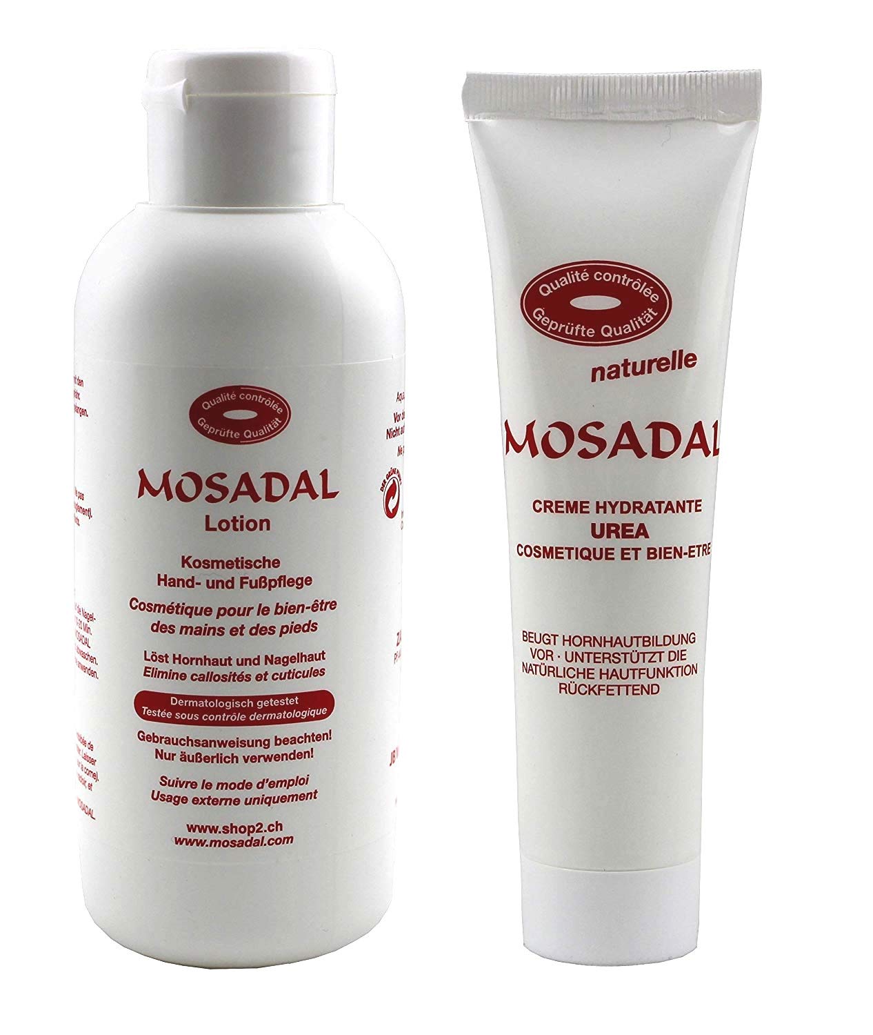 Mosadal hand and foot care set consisting of Mosadal Lotion The miracle cure for the problem-free and easy removal of horn and cuticles. Apply to the affected areas several times a week if necessary. Dangerous tools are now a thing of the past and the healthy epidermis is not injured.That is why this type of corneal removal is particularly suitable for diabetics. Ingredients: aqua, potassium hydroxides, glycerin Mosadal - cream hydrate urea For use after foot care with the Mosadal lotion twice a week. Intacts: Aqua, Urea, Stearyl Alcohol, Cetyl Alcohol, Ceteareth-25, Ceteareth-15, myreth-4, Glycerine Soy Oil, Cetearyl Alcohol, Glycerin, Simmondsia Chinensis Oil, Phenoxyethanol, Benzoic acid, dehydroacetic acid, citrus lemonum oil, citrus aurantium dulcis oil, litsea cubeba oil, citrus aurantifolia peel oil expressed, limonene, citral For an optimal result after the Mosadal Lotion application, use the Mosadal urea cream.The urea cream again improves the pH of the skin.delivery: 1x Mosadal Lotion 250 ml, 1x Mosadal Creme Hydrate Urea 100 ml. For an optimal result after the Mosadal Lotion application, use the Mosadal urea cream.The urea cream again improves the pH of the skin.Horn skin removal without hurt the healthy skin!.For beautiful hands and healthy feet!Dermatologically tested!.Mosadal hand and foot care set.Mosadal Hand- und Fußpflegeset bestehend aus MOSADAL - Lotion Das Wundermittel zur problemlosen und einfachen Entfernung von Horn- und Nagelhaut. Bei Bedarf mehrmals wöchentlich auf die betroffenen Stellen auftragen. Gefährliche Werkzeuge gehören nun der Vergangenheit an und die gesunde Epidermis wird nicht verletzt. Deshalb ist diese Art der Hornhautentfernung gerade auch für Diabetiker geeignet. Inhaltsstoffe: Aqua, Potassium Hydroxide, Glycerin MOSADAL - Creme Hydratante Urea Zur Verwendung nach der Fußpflege mit der Mosadal-Lotion 2x die Woche. Inhaltstoffe: Aqua, Urea, Stearyl Alcohol, Cetyl Alcohol, Ceteareth-25, Ceteareth-15, Myreth-4, Glycerine Soja Oil, Cetearyl Alcohol, Glycerin, Simmondsia Chinensis Oil, Phenoxyethanol, Benzoic Acid, Dehydroacetic Acid, Citrus Limonum Oil, Citrus Aurantium Dulcis Oil, Litsea Cubeba Oil, Citrus Aurantifolia Peel Oil Expressed, Limonene, Citral Für ein optimales Ergebnis nach der Mosadal Lotion Anwendung die Mosadal Urea Creme verwenden. Die Urea Creme verbessert wieder den pH-Wert der Haut.Lieferumfang: 1x Mosadal Lotion 250 ml, 1x Mosadal Creme Hydratante Urea 100 ml. Für ein optimales Ergebnis nach der Mosadal Lotion Anwendung die Mosadal Urea Creme verwenden. Die Urea Creme verbessert wieder den pH-Wert der Haut. Hornhautentfernung ohne die gesunde Haut zu verletzen!. Für schöne Hände und gesunde Füße! Dermatologisch getestet!. Mosadal Hand- und Fußpflegeset.Mosadal Kosmetische Hand- und Fußpflegeset 2 teilig - Bestehend aus 1x Mosadal Lotion 250 ml und 1x Mosadal Creme Hydratante Urea 100 ml