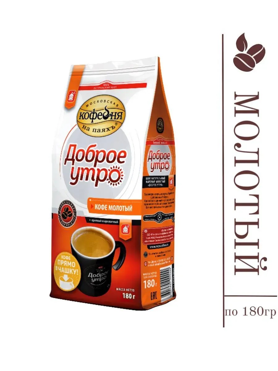 Кофе Московской Кофейни на ПаяхЪ Доброе утро 180 грамм молотый. Благодаря сочетанию лучших сортов Арабики из Эфиопии и Камеруна, с добавлением Робусты, и особой обжарки, удалось создать яркий насыщенный вкус и неповторимый аромат. Крепкий насыщенный вкус с приятной горчинкой и глубокий аромат позволят Вам насладиться настоящим кофе. Специальный клапан на пакете гарантирует сохранение вкуса и аромата свежеобжаренного молотого кофе.