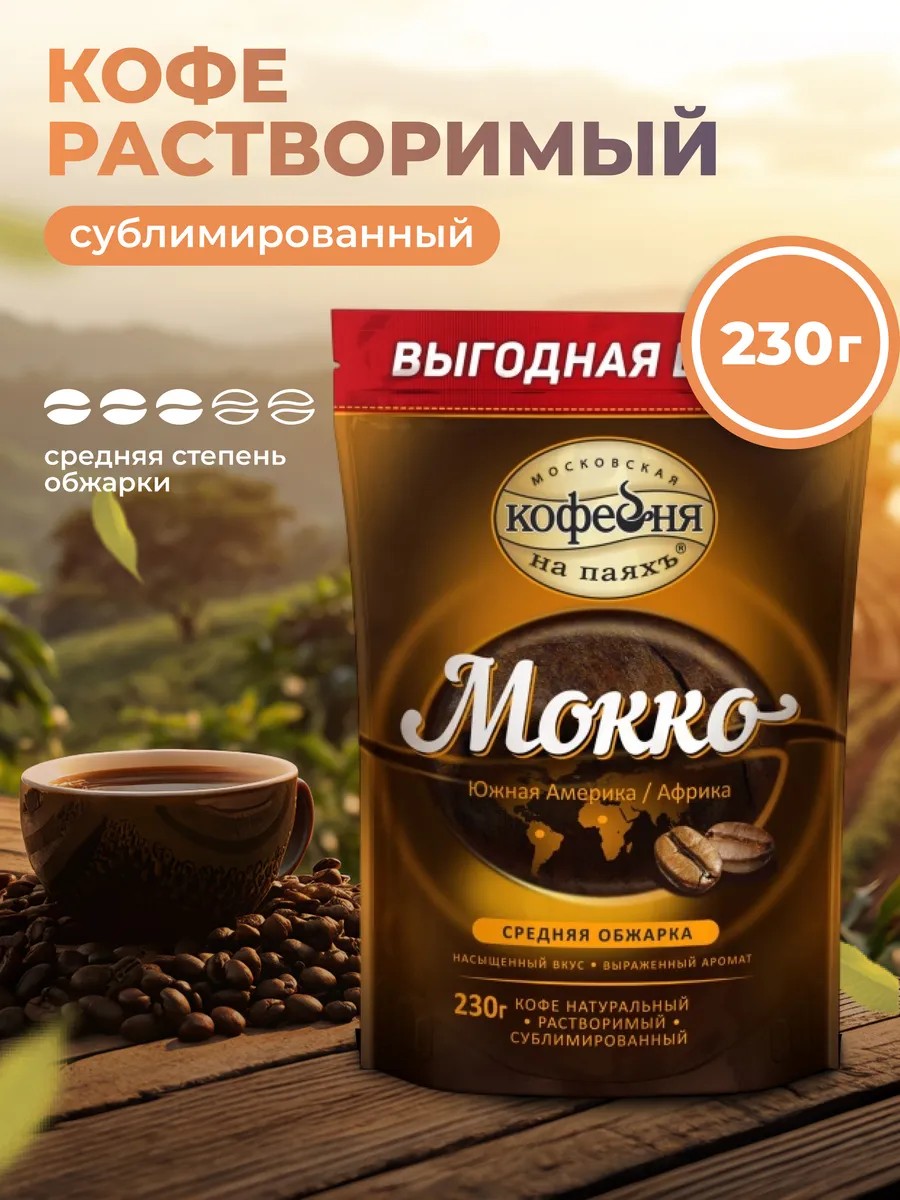 Растворимый сублимированный кофе "Мокко" от Московской кофейни на паяхъ – это натуральный напиток из 100% арабики средней обжарки. Ароматный кофе в мягкой упаковке 230г – идеальный выбор для тех, кто ценит качество и удобство.