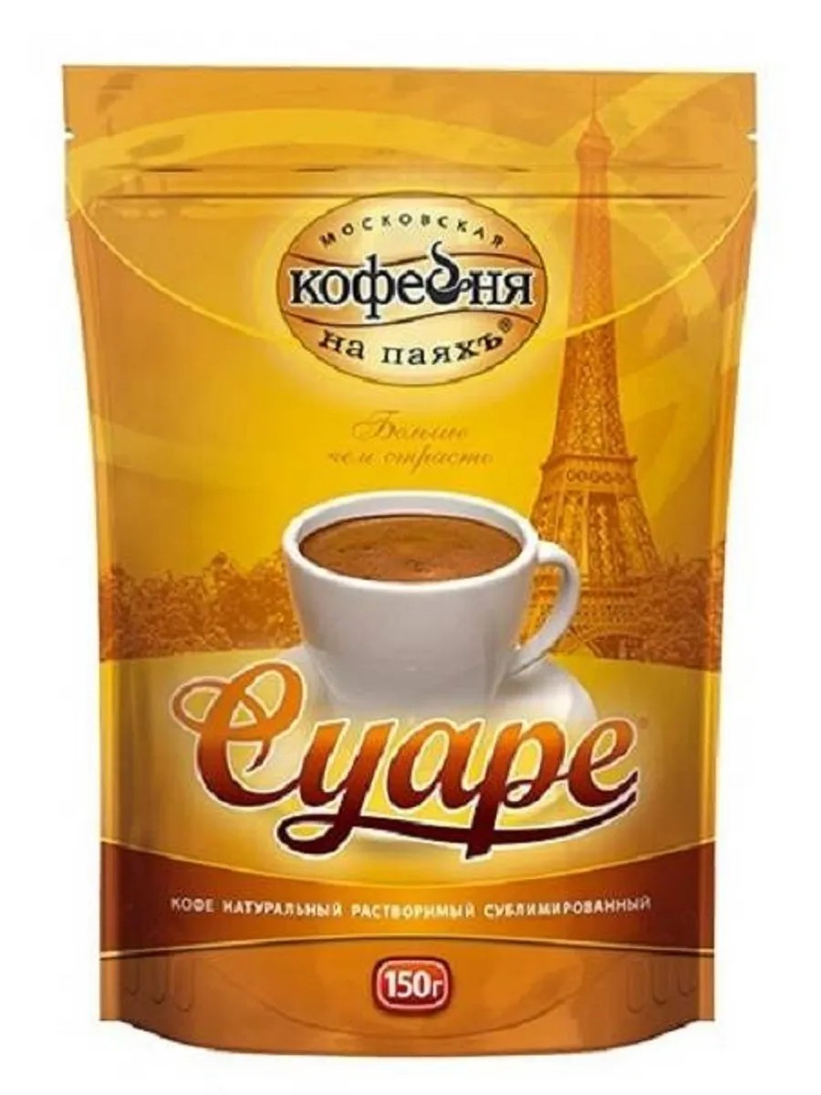 Московская Кофейня на паяхъ Кофе растворимый сублимированный Суаре, 150 гр. Кофе Суаре натуральный растворимый сублимированный 150 г от Московской кофейни на паяхъ отличается крепким, насыщенным вкусом с благородной горчинкой и великолепным ароматом. Слово суаре означает званый вечер с легкой шутливой атмосферой. Московская кофейня на паяхъ создает качественный кофе благодаря неизменным составляющим: квалифицированные специалисты с большим опытом работы, современное высокотехнологичное оборудование и любовь к своему делу. На сегодняшний день компания - один из лидеров на российском рынке.