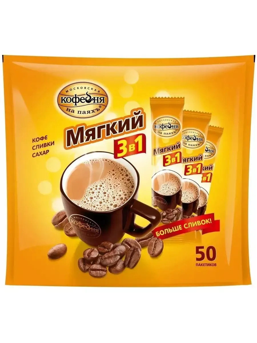 МОСКОВСКАЯ КОФЕЙНЯ НА ПАЯХЪ Кофе растворимый 3в1 мягкий, 50 пакетов.
