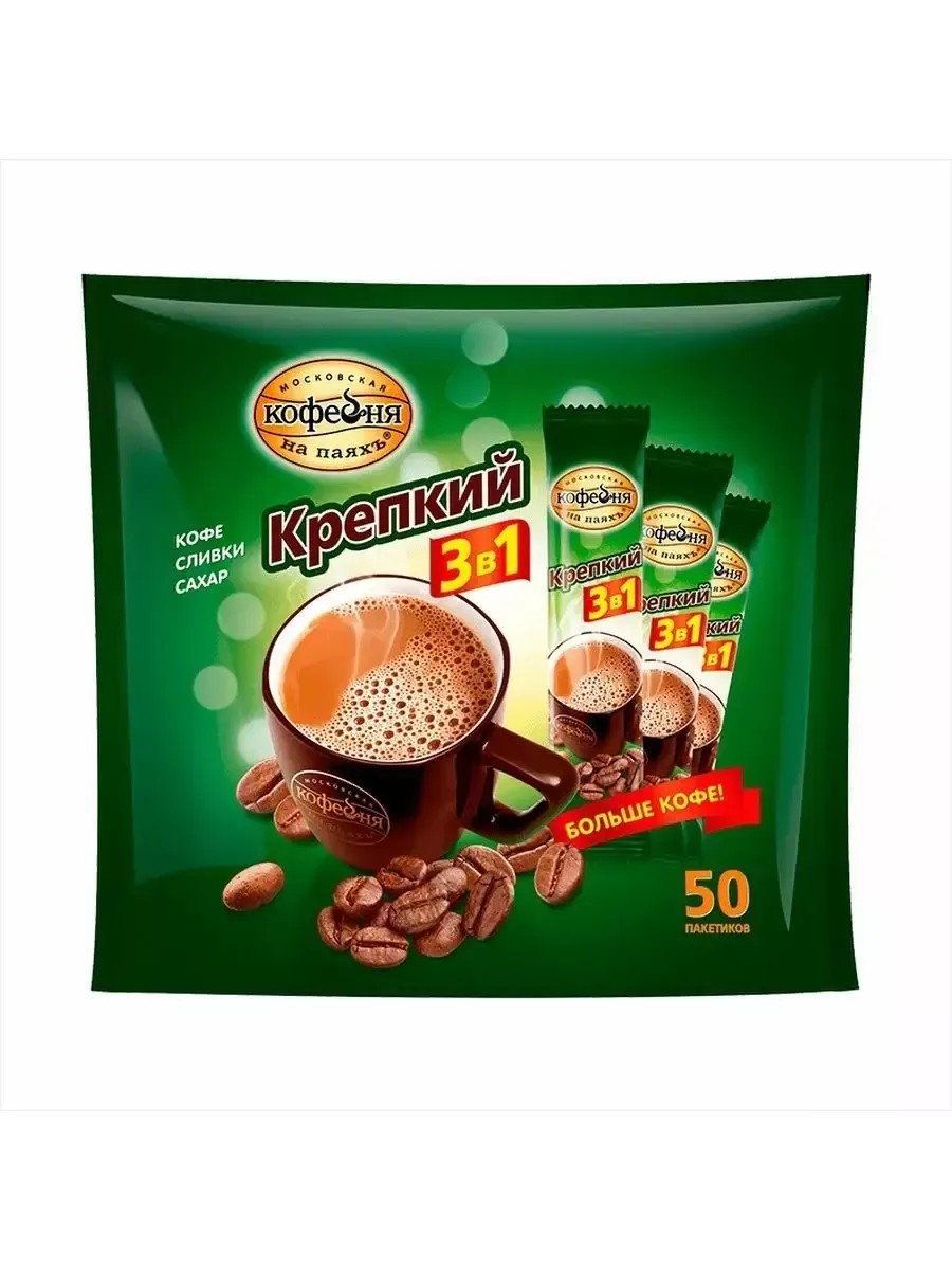 Московская Кофейня на ПаяхЪ, Растворимый кофе Крепкий 3в1, в упаковке 50 пакетиков по 16 гр. Это универсальный кофейный напиток для любого момента из коллекции МОСКОВСКАЯ КОФЕЙНЯ НА ПАЯХ, 16 гр по 50 пакетиков. Удобная упаковка в форме порционных пакетиков позволит насладиться восхитительным кофейным ароматом и насыщенным вкусом кофе где и когда удобно. Преимущества напитка: Быстро – не нужно ждать, пока приготовится напиток, достаточно просто взять пакетик, налить 150 мл горячей воды и размешать. Удобно – напиток уже содержит 3 ингредиента: кофе, сахар, сливки.Всегда с собой – можно брать на работу, на прогулку. Качественно – производитель гарантируем сохранность вкусовых параметров в каждом напитке. Хранить при температуре не выше 20 С и относительной влажности не более 75%. Условия хранения: Хранить в прохладном сухом месте без посторонних запахов при относительной влажности воздуха не более 70%. Не подвергать воздействию прямого солнечного света.