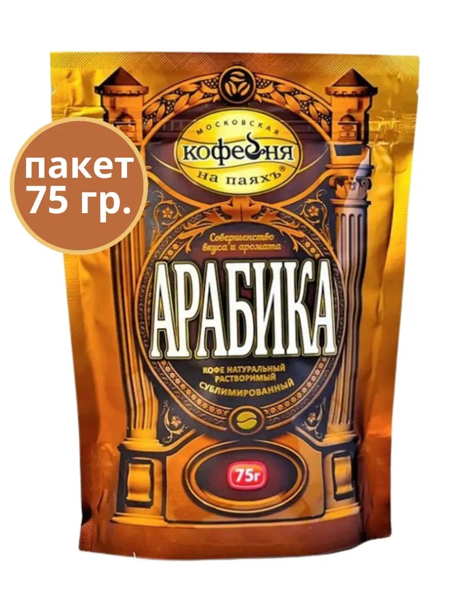 Московская кофейня на паяхъ представляет изысканный растворимый кофе Арабика в удобной упаковке весом 75 грамм.