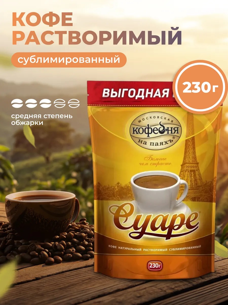 Кофе растворимый "Суаре" – это натуральный сублимированный напиток средней обжарки от Московской кофейни на паяхъ. Упакованный в мягкую упаковку 230г, этот ароматный кофе станет идеальным подарком и ежедневным вкусным ритуалом.
