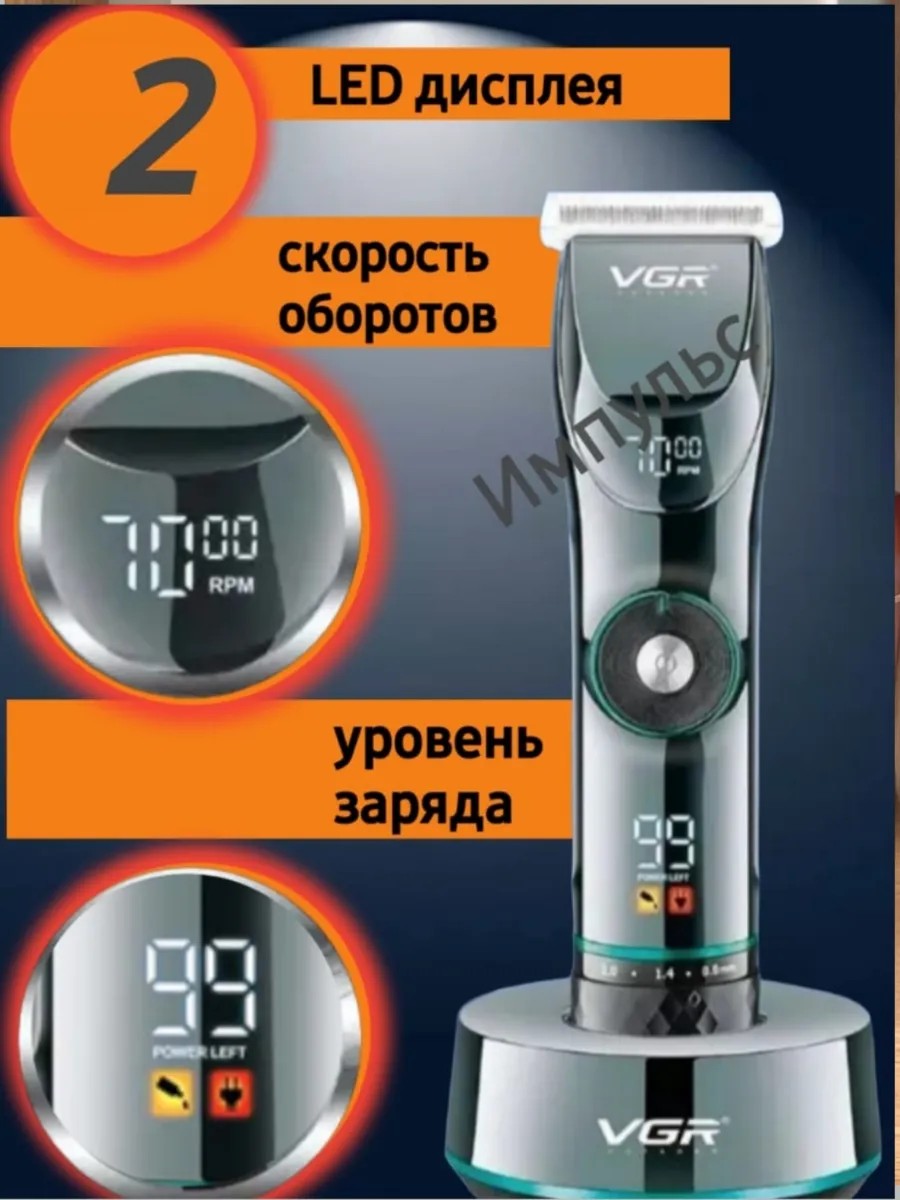 Профессиональная машинка для стрижки волос . Имеет мощный роторный мотор на 10 Вт и достаточно низкий уровень шума и вибрации в 50 дБ . Есть 4 ступени регулятора оборотов двигателя вплоть до 7000 об/мин. Идеально подходит и для взрослых и для детей, легко справляется со всеми типами волос, а также пригодится для стрижки бороды. Без проблем справляется с мягкими детскими волосами и густой жесткой бородой. Аккумулятор емкость 2500 mAh обеспечивает до 6.5 часов автономной работы. Очень удобный LED дисплей который отображает уровень заряда аккумулятора, обороты двигателя и датчика уровня масла. Наша аккумуляторная машинка для стрижки так же может использоваться от сети во время зарядки. Salon Series означает что данная модель относится к профессиональной линейке. В комплекте так же идёт магнитная док-станция на которой можно удобно и почти быстро зарядить инструмент и длинный кабель для комфортной работы от сети. Лезвия выполнены из особого сплава нержавеющей стали и имеют R-образные форму для того чтобы не травмировать кожу, и при этом они не перегреваются и не требуют заточки. Стандарт ножа А5, ширина 4,5 см. Подходят насадки от других брендов аналогов. На машинке присутствует 4 ступенчатый регулятор длины среза, что упрощает работу и подбор насадок. Диапазон стрижки без насадки 0.3 – 2 мм. Вес устройства 270 гр. Корпус аппарата выполнен из прочного ABS пластика. Стильный дизайн и отличная эргономика это то, что выделяет наши машинки для волос и бороды из серой массы.В комплекте 6 профессиональных насадок от 1,5 до 12 мм, масло, щётка для чистки и кабель USB для зарядки.Отлично подойдет и для работы в салоне и для домашнего пользования. Упаковка выглядит премиально и подойдет в роли идеального подарка мужчинам да и женщинам. VGR один из лучших аналогов известных брендов таких как Philips, Panasonic, Braun, Remington, Moser, Rowenta, Xiaomi, Samsung который не уступает в качестве, по доступной цене. Использование бренда исключительно для поиска.