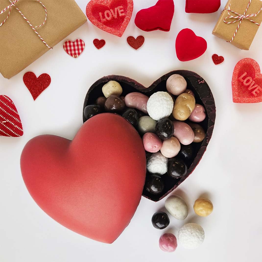 Chocolate couverture 66 cocoa - Cocoa paste - Cocoa butter - Sucrose - Glucose Trimoline - Almond - Hazelnut - Royaltine - Butter - UHT fresh cream - Milk powder - Emulsifier - Soy lecithin - Vanilla flavoringChocodic Master artisan chocolatier for 20 years. Handcrafted in our chocolatier in Vendée, La Roche-sur-Yon. Crystal bag packaging - Ready to give as a gift. Dimensions approximately 10x10x5cm - 170g. A lovely heart-shaped box ENTIRELY MADE OF CHOCOLATE: milk chocolate, dark and white chocolate fritters, chocolate-coated cereal balls, homemade chocolates. Couverture chocolat 66 de cacao - Pâte de cacao - Beurre de cacao - Saccharose - Glucose Trimoline - Amande - Noisette - Royaltine - Beurre - Crème fraîche UHT - Poudre de lait - Emulsifiant - Lécithine de soja - Arôme de vanilleChocodic Maître artisan chocolatier depuis 20 ans. Fabriqué de facon artisanale dans notre chocolatier en vendée à la Roche sur Yon. Emballage sachet cristal - Prêt à offrir. Dimensions environ 10x10x5cm - 170g. Un joli coffret ENTIEREMENT EN CHOCOLAT en forme de coeur : des fritures en chocolat lait noir blanc, des billes de céréales enrobées de chocolat, des chocolats maison.