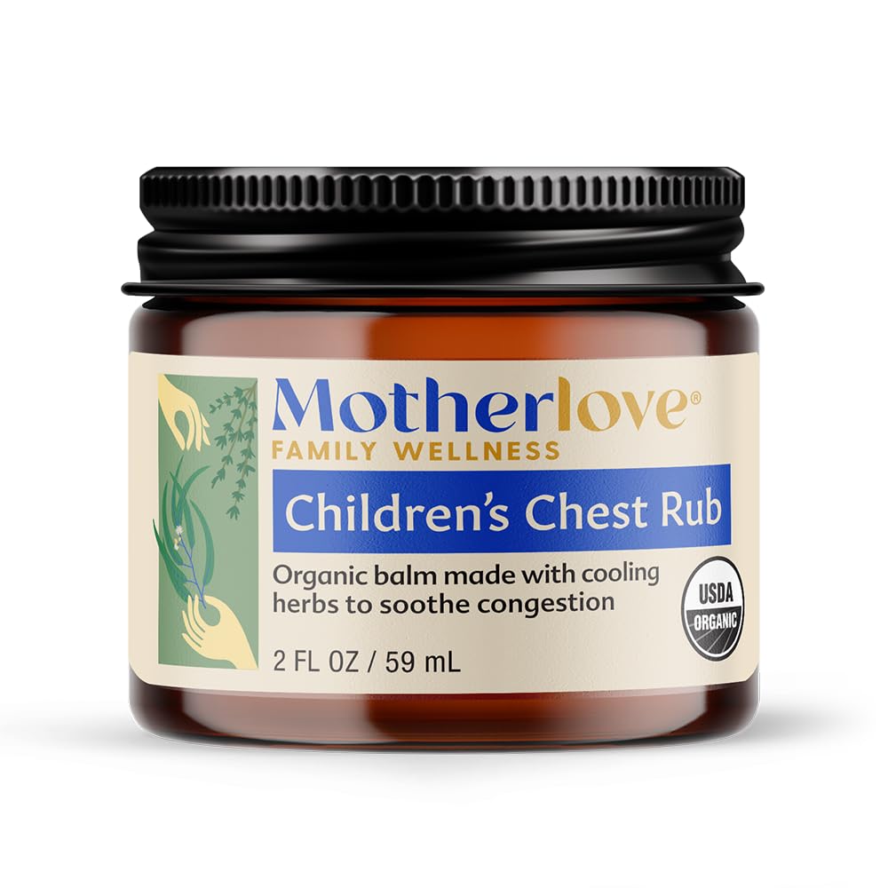 Motherlove Difference: Children's Chest Rub is Certified Organic by Oregon Tilth, Certified Cruelty Free by Leaping Bunny, and made in the USA with imported ingredients. Free of petroleum and petroleum by-products, lanolin, parabens, phthalates, and synthetic fillers. Motherlove is a certified Women-Owned B-Corp that focuses on environmental and social responsibility. Suggested Use: Massage onto chest, back, or the bottoms of feet to help soothe congestion. Avoid contact with eyes, face and nose. Do not use with chronic respiratory conditions or asthma. For external use only. Not for use under 2 years of age. Test on small area of skin first. Discontinue use if adverse side effects appear. Clean Ingredients: Sunflower seed oil, beeswax, thyme leaf extract, chamomile flower extract, calendula flower extract, lavender flower extract, eucalyptus leaf oil, peppermint oil. All organic. Nothing else. Powerful Organic Herbs: Made with the aromatic herbs eucalyptus and peppermint, immune supporting herb thyme, and soothing herbs lavender and chamomile. Sick Day Support: Organic balm made with cooling herbs to soothe congestion and support family wellness during sick season. And let's be honest, every season seems to be sick season when you have kids.