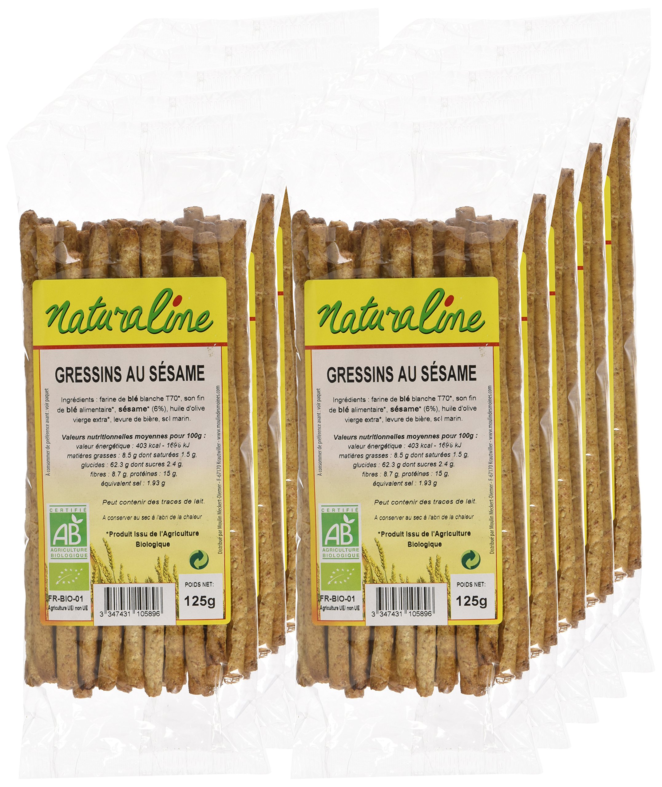 INGREDIENTS white WHEAT flour t70, fine edible WHEAT bran, SESAME (6 ), extra virgin olive oil, brewer's yeast, sea salt.Store in its packaging, away from light, air, and moisture. Ingredients from organic farming 100 . These organic sesame breadsticks are perfect for all your aperitifs and snacks. INGRÉDIENTS farine de BLÉ blanche t70, son fin de BLÉ alimentaire, SÉSAME (6 ), huile d'olive vierge extra, levure de bière, sel marin.A conserver dans son emballage, à l'abri de la lumière, de l'air et de l'humidité. Ingrédients agricoles issus de l'agriculture biologique 100 . Les gressins au sésame bio accompagneront tous vos apéritifs et vos pauses gourmandes.