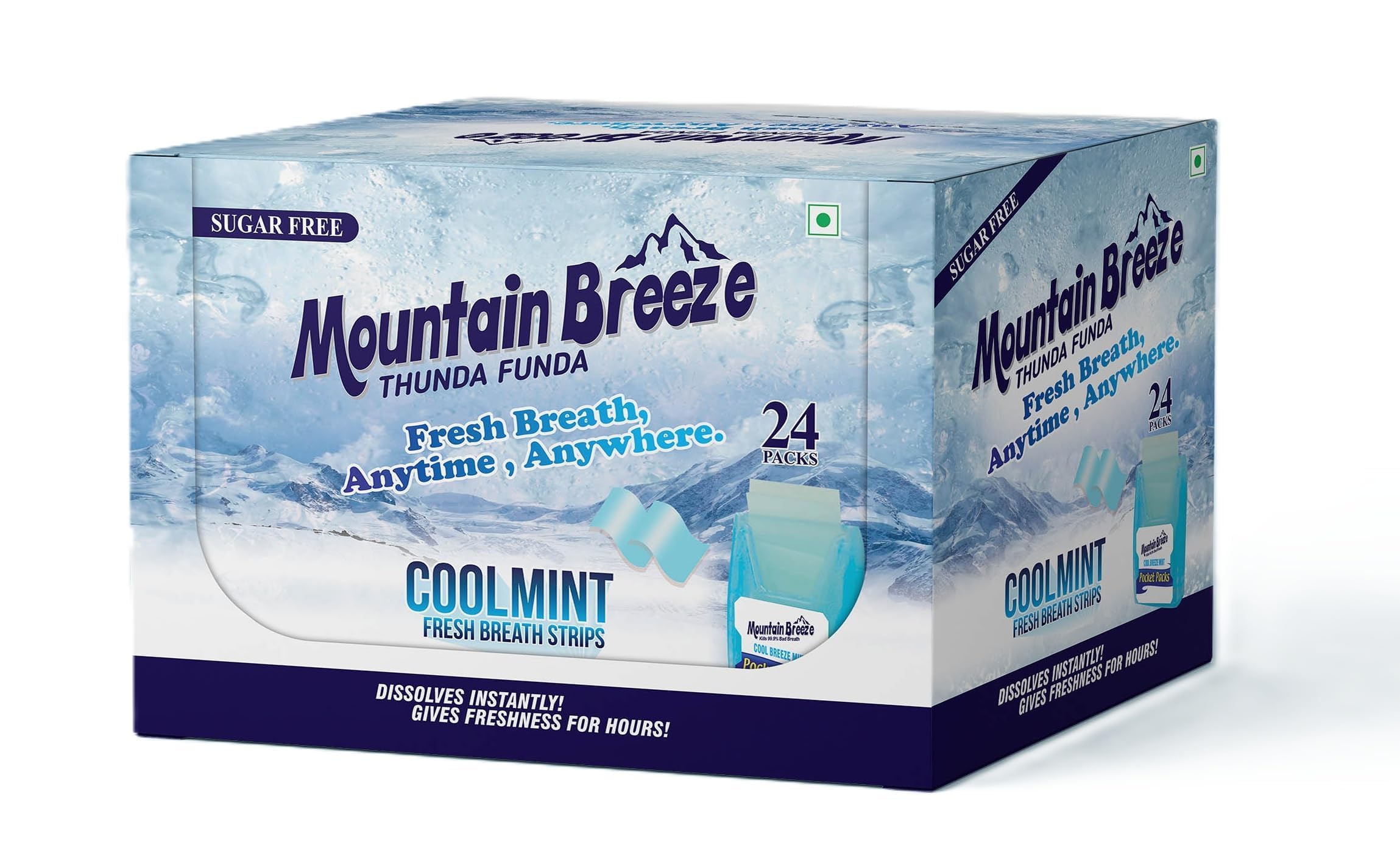 Mountain Breezefresh breath strips are available in the new refreshing Coolmint Freshflavor. These fresh breath strips are made using the uniqueOrally Disintegrating Strip (ODS)technology. They dissolve instantly in the mouth, bad breath germs and giving long-lasting freshness.Mountain Breeze Coolmint Freshfresh breath strips are available in four sizes of easy-to-carry packs, a pouch with 24 cassettes with strips of 24 strips each cassette.
