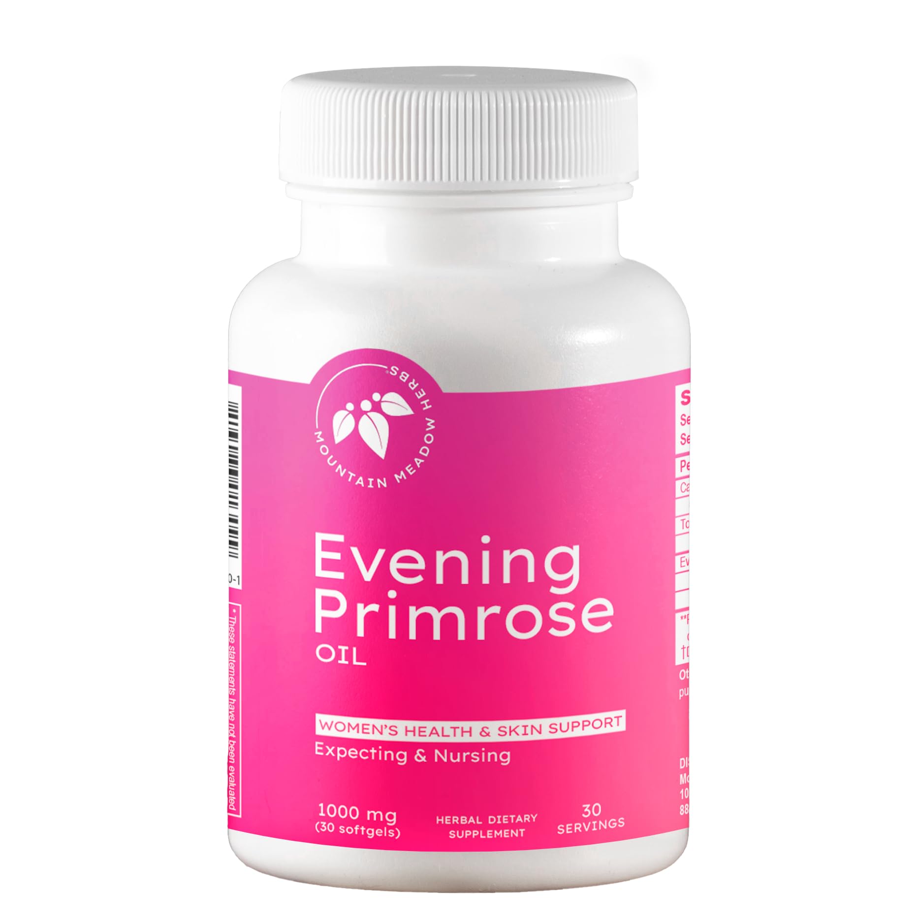 Unlock the natural benefits of Mountain Meadow Herbs Evening Primrose Oil—a premium supplement designed to support women's wellness, hormonal balance, and skin hydration. Each capsule contains 1000 mg of pure Evening Primrose Oil, a rich source of Omega-6 essential fatty acids that contribute to overall well-being. Formulated with a gluten-free composition, it's ideal for those with dietary restrictions. Whether you're seeking hormonal support or skin nourishment, this high-quality supplement is a must-have in your daily routine.One-Month Supply of Convenient Capsules – Daily Support: Each bottle contains a 30-day supply of easy-to-take capsules, designed for effortless daily use to help you stay consistent with your wellness routine. Gluten-Free Evening Primrose Oil - For Women's Health: This gluten-free formula is crafted for those with gluten sensitivities or dietary restrictions, ensuring safe and effective support. It provides the benefits of evening primrose oil without digestive discomfort, making it an ideal choice for those seeking a non-GMO, allergen-free wellness supplement. Promotes Clear, Radiant Skin: Supports skin health by reducing blemishes, refining texture, and improving overall complexion. Enriched with essential fatty acids, it provides lasting hydration, preserves skin elasticity, and promotes a smooth, youthful glow. Hormonal Balance Support for Women: Helps regulate hormones and provide relief from menstrual irregularities, hot flashes, mood swings, and bloating. Designed to support women's overall health, it promotes hormonal balance, well-being, and vitality. Additionally, it offers benefits during pregnancy by supporting a healthy hormonal environment, aiding in mood stability, and contributing to overall maternal wellness. Potent Omega-6 Fatty Acids: Each capsule provides a potent 1,000 mg dose of essential Omega-6 fatty acids, vital for maintaining overall wellness. These beneficial fats support healthy skin, balanced hormone function, and overall vitality, helping you feel your best every day.