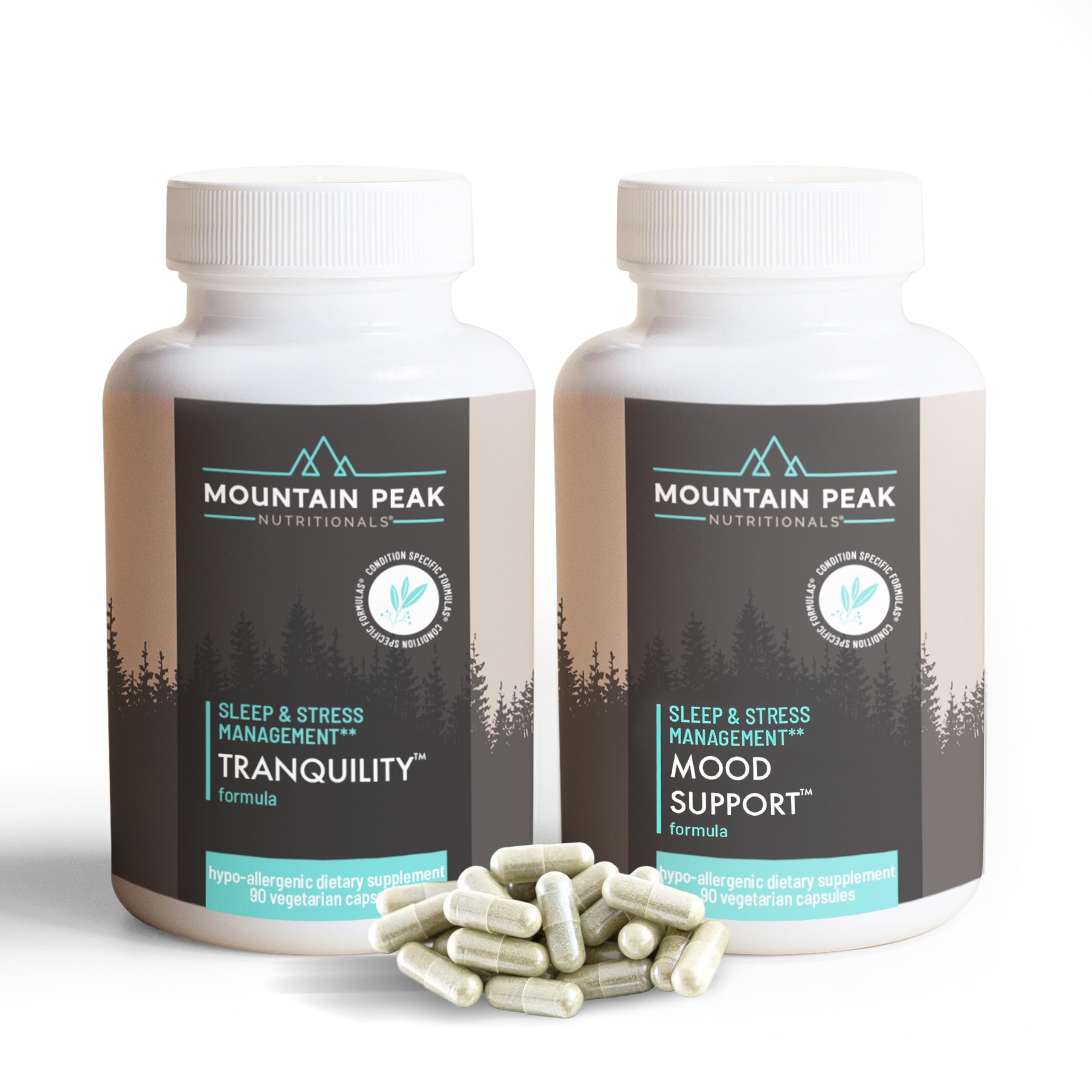 Find balance and support your emotional well-being with the Mountain Peak Nutritionals Tranquility Mood Support Bundle. This two-part supplement set is designed to help manage stress, improve sleep, and support a positive outlook naturally. Tranquility Formula combines Vitamin B6, Vitamin B12, and adaptogens to promote calm, relaxation, and restorative sleep while supporting brain health and stress resilience. Mood Support Formula is specially crafted to encourage healthy serotonin levels, helping stabilize mood and promote emotional balance throughout the day. Both formulas are hypoallergenic, vegetarian, and made with high-quality ingredients, offering safe and effective daily support. Together, they create a comprehensive approach to managing stress, improving sleep quality, and maintaining a healthy emotional state.OUR MISSION: Mountain Peak Nutritionals aims to create the highest quality nutritional supplements by combining the most pure and clinically proven ingredients into Condition Specific Formulas. SUGGESTED USE: Enjoy daily wellness support with 1-2 Tranquility capsules and 1 Mood Support capsule up to 3 times daily, taken with water and food. This product is not FDA evaluated and is not intended to diagnose, treat, or prevent any disease. QUALITY INGREDIENTS: Formulas feature trusted nutrients and botanicals including B6, B12, Ashwagandha, 5-HTP, L-Theanine, St. John's Wort, Ginkgo Biloba, and more. Made with safe, hypoallergenic, vegetarian ingredients. MOOD LIFTING SUPPLEMENT: Mood Support formula is based on extensive scientific research that indicates imbalances in brain chemistry may be associated with nutrient deficiencies. CALM AND RELAXED: Tranquility formula contains specific amino acids, vitamins, magnesium, and botanical ingredients that help support positive feelings and may help restore and optimize neurotransmitter function.