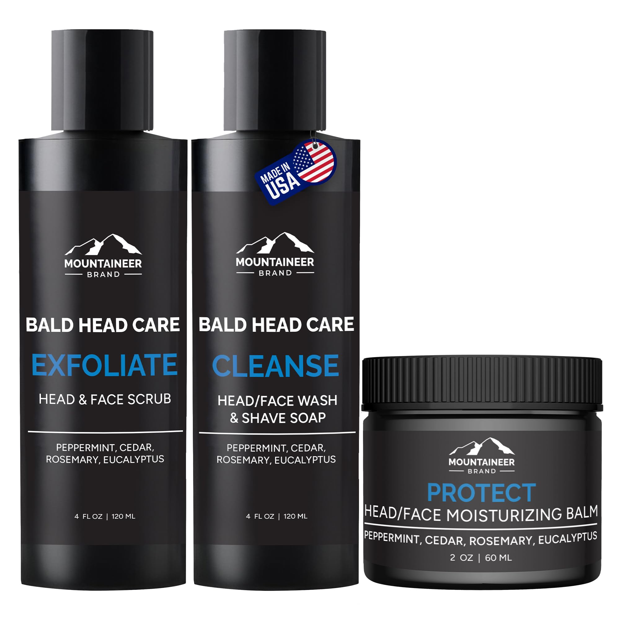 Mountaineer Brand Bald Head Care Gifts For Bald Men | All Natural 3 Step Daily Skin Care for Healthy Scalp & Face | Exfoliate Scrub | Cleanse Wash | Protect Moisturiser | Made in West Virginia