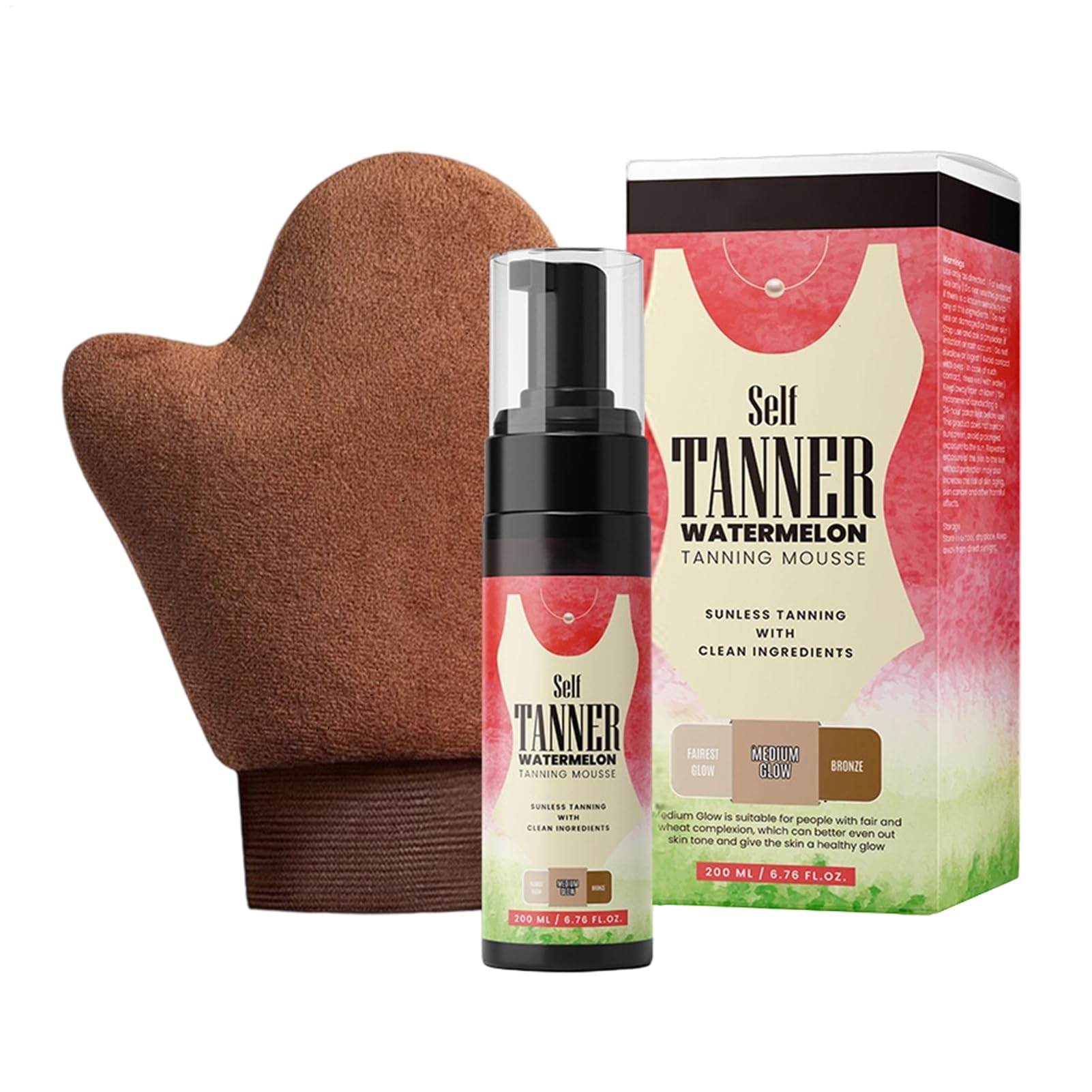 Decorative and portable packaging: Packaged in a vibrant red bottle with a compact design that's easy to carry in a beach bag, suitcase, or makeup bag, combining visual appeal with practical functionality for anyone looking to maintain a healthy glow. Lightweight, quick-drying texture: Features a fast-absorbing formula that dries quickly to prevent transfer onto clothing or sheets, making it easy to use while traveling and leaving skin feeling soft and refreshed without any stickiness. Long-lasting, buildable color: Designed to provide a long-lasting, tanned glow that gradually deepens with continued use, offering flexible application for a subtle or bold tan that can be customized to your preferences—perfect for travel and everyday wear. Includes a glove applicator for easy application: Comes with a soft glove applicator that ensures streak-free coverage and protects hands from stains, allowing users to smoothly apply the mousse to the skin with better control, making at-home tanning simple. Natural tanning formula for a sunless glow: delivers a smooth, even tan without sun exposure using a rich red formula that enhances natural skin tones, creating a warm, sun-kissed appearance suitable for all skin types and ideal for beach days.