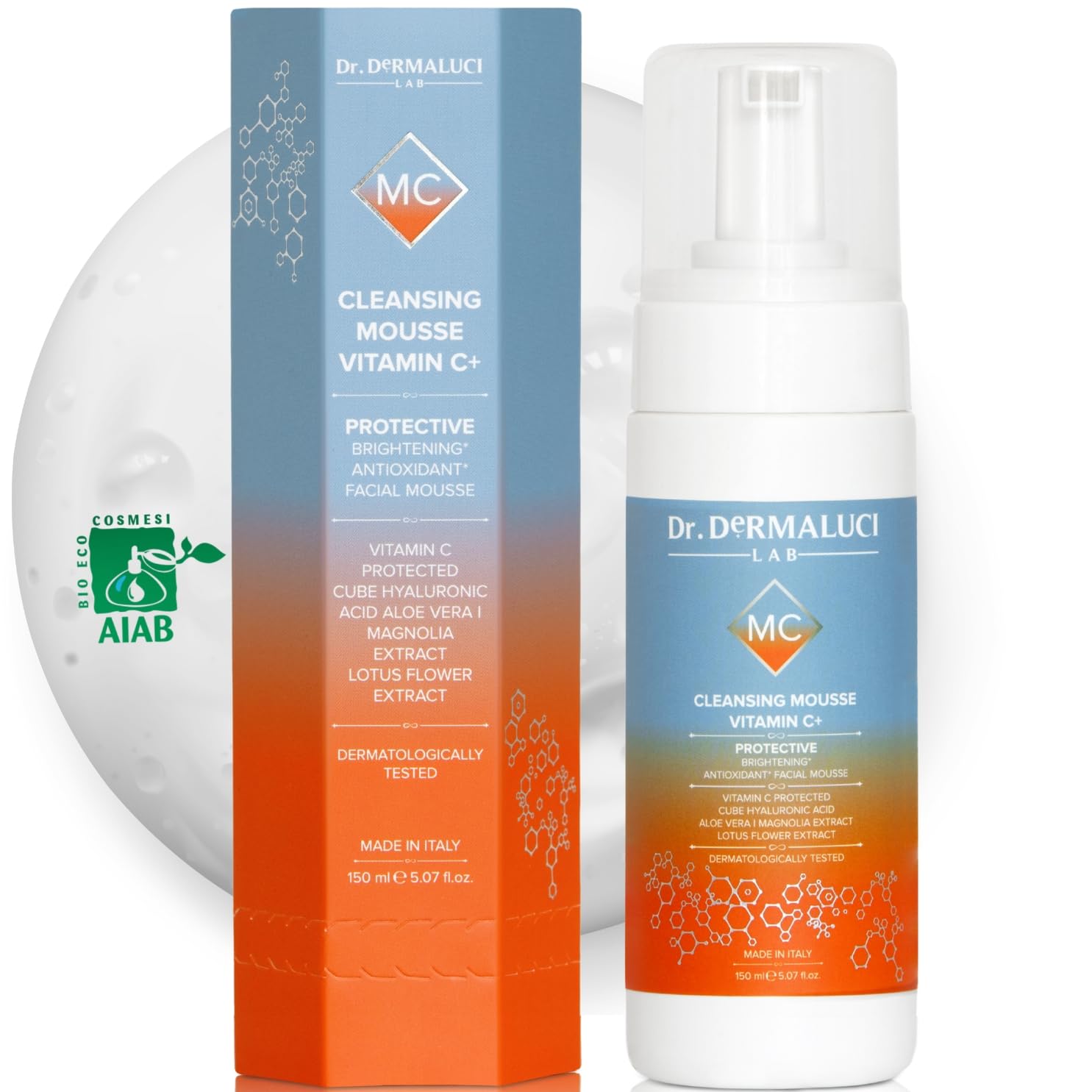 : Morning and night, your skin deserves a moment of genuine pampering. Dr. Dermaluci Lab's Organic Vitamin C Cleansing Foam transforms cleansing into a mindful ritual: a creamy, velvety foam that removes impurities, excess oil, and makeup while providing immediate radiance and comfort. Its advanced formula combines stabilized Vitamin C and Hyaluronic Acid in three molecular weights for deep hydration and visibly firmer, more even-toned skin. Organic Aloe Vera, natural Betaine, and extracts of Magnolia and Lotus Flower soothe, balance, and protect even the most sensitive skin. Certified organic by AIAB, nickel tested, and dermatologically tested, it is sulfate-free, paraben-free, and alcohol-free. Its bottle is 100 recyclable and made from recycled plastic, for beauty that respects both your skin and the planet. Use morning and evening as the first step in your Dr. Dermaluci Lab routine, before serums and creams. Each application is a breath of purity that restores balance and natural radiance. Ingredients: Aqua, Propanediol, Lauryl glucoside, Cocamidopropyl betaine, Glycerin, Betaine, Magnolia Biondii bud flower extract, Sodium ascorbyl phosphate, Aloe Barbadensis Leaf Juice ( ), Sodium Hyaluronate, Nelumbo nucifera root extract, Benzyl alcohol, Tetrasodium glutamate diacetate, hexylglycerin, Parfum, Sodium benzoate, Potassium sorbate, Citric acid, Linalyl aceate, Hexyl cinnamal, Tetramethyl acetyloctahydronaphthalenes, Linalool, Citronellol, Terpineol. P.when('A').execute(function(A) { A.on('a:expander:toggle_description:toggle:collapse', function(data) { window.scroll(0, data.expander. expander[0].offsetTop-100) }) }) Directions for Use: Apply a small amount of foam to a damp face and gently massage in circular motions, avoiding the eye area. Rinse with lukewarm water. Use morning and evening. Safety Warning: For external use only. Avoid direct contact with eyes. If contact occurs, rinse thoroughly with clean water. Store in a cool, dry place. Keep out of reach of children. See moreHOW TO INTEGRATE IT INTO YOUR DR. DERMALUCI LAB ROUTINE? Use it morning and evening as the first step in your beauty ritual. Then, apply the Vitamin C Serum followed by the Marine Collagen Cream to nourish and firm the skin. A complete journey for radiance and well-being. ? AN ORGANIC FORMULA RESPONSIBLE PACKAGING MADE IN ITALY Certified AIAB ORGANIC, Nickel Tested, and dermatologically tested, the foam is safe even for reactive skin. The bottle is recyclable and made from recycled plastic for an ethical and sustainable routine. WHY IS IT SUITABLE FOR SENSITIVE SKIN? Thanks to organic Aloe Vera, Betaine, Magnolia, and Lotus Flower, it soothes redness and irritation, restores balance, and provides immediate comfort. Skin is velvety, soothed, and protected. WHAT IS THE POWER OF STABILIZED VITAMIN C? A powerful antioxidant that protects skin from pollution and oxidative stress. It stimulates collagen production, evens skin tone, and restores radiance. Day after day, skin looks younger, smoother, and full of energy. HOW DOES THREE-POINT HYALURONIC ACID WORK? An exclusive complex for multi-level hydration: on the surface, it retains water in the mid-depth layer, it strengthens the skin's structure and in the inner layers, it boosts elasticity. The result: denser, plumper, and naturally hydrated skin. LOOKING FOR AN EFFECTIVE YET ULTRA-GENTLE CLEANSER? This foam cleanses deeply without disrupting the skin barrier, removing impurities, sebum, and makeup in one step. Its creamy texture leaves the skin feeling fresh, soft and luminous — ideal even for dry or sensitive skin.Description du produit Matin et soir, votre peau mérite un moment de douceur authentique. La Mousse Nettoyante Bio à la Vitamine C de Dr. Dermaluci Lab transforme le nettoyage en un rituel conscient : une mousse crémeuse et veloutée qui élimine impuretés, sébum et maquillage tout en apportant éclat et confort immédiat. Sa formule avancée combine de la Vitamine C stabilisée et de l'Acide Hyaluronique à trois poids moléculaires pour une hydratation profonde et une peau visiblement plus tonique et uniforme. L'Aloe Vera BIO, la Bétaïne naturelle, les extraits de Magnolia et de Fleur de Lotus apaisent, équilibrent et protègent même les peaux les plus sensibles. Certifiée BIO par l'AIAB, Nickel Tested et testée dermatologiquement, elle est sans sulfates, sans parabènes, sans alcool. Son flacon est 100 recyclable et fabriqué à partir de plastique recyclé, pour une beauté respectueuse de la peau et de la planète. À utiliser matin et soir comme première étape de votre routine Dr. Dermaluci Lab, avant sérums et crèmes. Chaque application est un souffle de pureté qui redonne équilibre et éclat naturel. Ingrédients Aqua, Propanediol, Lauryl glucoside, Cocamidopropyl betaine, Glycerin, Betaine, Magnolia Biondii bud flower extract, Sodium ascorbyl phosphate, Aloe Barbadensis Leaf Juice ( ), Sodium Hyaluronate, Nelumbo nucifera root Extrait, Benzyl alcohol, Tetrasodium glutamate diacétate hexylglycerin, Parfum, Sodium benzoate, Potassium sorbate, Citric acid, Linalyl acéate, Hexyl cinnamal, Tetramethyl acetyloctahydronaphthalenes, Linalool, Citronellol, Terpineol. P.when('A').execute(function(A) { A.on('a:expander:toggle_description:toggle:collapse', function(data) { window.scroll(0, data.expander. expander[0].offsetTop-100) }) }) Mode d'emploi MODE D'EMPLOI: Appliquer une petite quantité de mousse sur le visage humide, masser délicatement en mouvements circulaires en évitant le contour des yeux. Rincer à l'eau tiède. Utiliser matin et soir. Avertissement De Sûreté AVERTISSEMENTS: Usage externe uniquement. Éviter le contact direct avec les yeux. En cas de contact, rincer abondamment à l'eau claire. Conserver dans un endroit frais et sec. Tenir hors de portée des enfants. Voir plusCOMMENT L'INTÉGRER DANS VOTRE ROUTINE DR. DERMALUCI LAB ? Utilisez-la matin et soir comme première étape de votre rituel beauté. Ensu